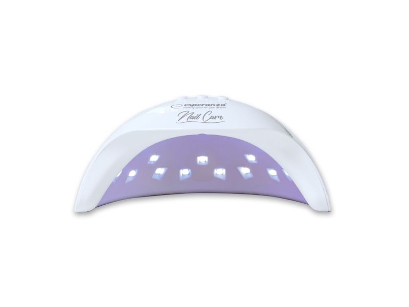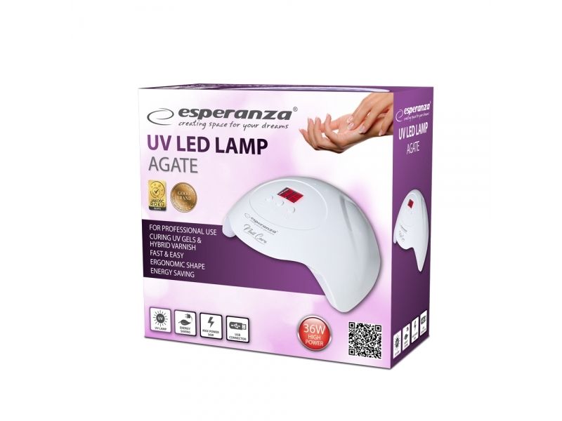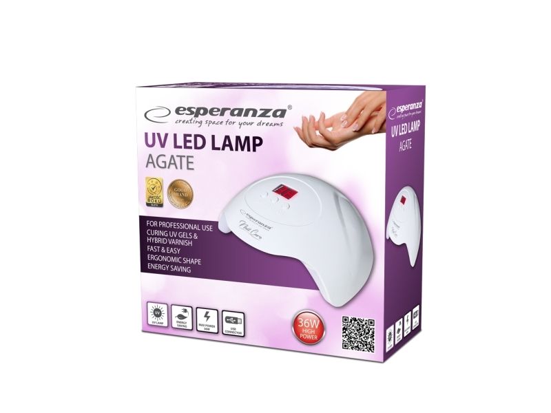 The professional Esperanza Agate UV lamp allows you to forget about frequent visits to beauty parlors and expensive manicure. It enables you to make it quicker, cheaper and exactly how you want it to be. The lamp evenly cures all hybrid, acrylic, gel varnishes and other nail products that need to be cured with UV light. The lamp is perfect both for manicure and pedicure at home and for professional beauty parlors. It is equipped with 15 efficient LEDs with the total output of 36 W giving white light and double wavelength of 365 nm and 405 nm. It has a motion sensor and a curing time display which facilitate operation. Your nails will be beautiful and shiny for many days or even weeks.