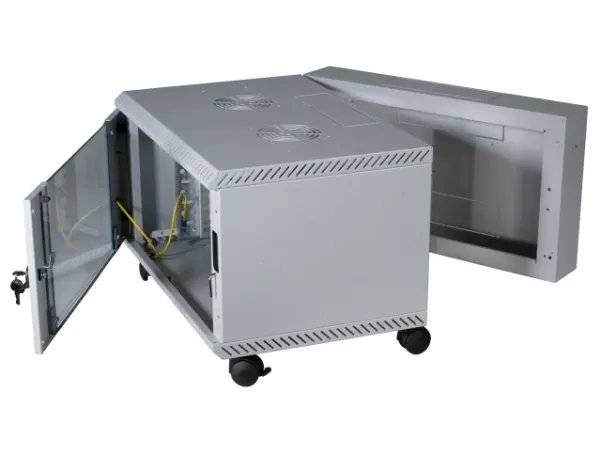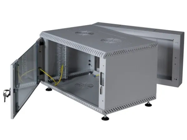- Steel sheet housing with welded frame, pre-assembled, self-ventilated - Rear sided swing-frame for swiveling the front part of the housing - Prepared for Plug & Play 2-fan unit Art.-No. 691656xx - Bottom with 4 x mounting point for leveling feet or castor set (please order separately) - Front door with metal hinges for increased stability - Pre-punched openings for cable entry optionally from roof or bottom - Prepared for mounting of single fan units in roof and bottom - Inside front-sided 2 x 19“ profile rails, galvanised, depth-adjustable - Front door with window made of certified safety glass - Front door lockable with latch