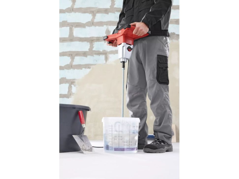 1200 watt 2-trins omrører med 3-trins omomdrejningstal Robust 2-trins gearkasse: Stort dimensioneret og optimalt oversat - til materialerigtigt omdrejningstal og et stærkt drejningsmoment fuldakselelektronik: Med blød start, temperaturovervågning, overbelastningsbeskyttelse og med trinløs hastighedsregulering med accelerationskontakt - for en kontrolleret opstart til den optimale rørehastighed. Høj trækkraft ved alle omdrejningstal. Komfortabel 3-trins kontakt kan nås uden afbrydelse af arbejdet fra gribeposition, beskyttet af gummitylle. Trin 1: Rengøring, trin 2: Røre, trin 3: Rør ind-/ud-kontakt med fastlåsning og sikring mod genstart. ideal til stationær anvendelse i et blandingscenter. Den fleksible gummitylle beskytter mod snavs via tænd/sluk-kontakten. Ingen funktionsfejl takket være tilklæbende kontakter ergonomisk greb på drevet: lav vægt, afslappet armposition og højre kropsposition til en komfortabel og kraftskånende betjening. fire stødhjørner med gummibuffer sørger for en sikker opbevaring under transport og giver beskyttelse mod stød og slag på byggepladsen over motorhuset. Gør det nemmere at skifte rørepind til blandingsanvendelser op til 60 kg med rørepind WR2 til omrører: Pasi op til seje. Fliseklæber, fugemasse, udligningsmasse, lim, færdig puds, klæbemørtel ...