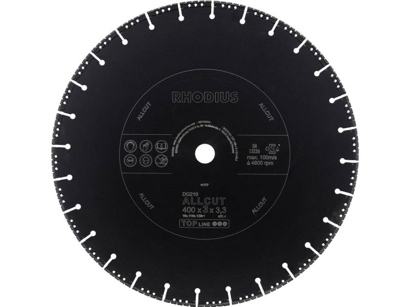 Rhodius DG210 ALLCUT, diamantskæreskive 400 x 3,0 x 3,3 x 25,40 mm, lige, Topline, til universel anvendelse Maskegnethed: Diamantskæreskive DG210 ALLCUT er både egnet til brug med hånden og til stationær anvendelse: Til vinkelsliber, benzinadskiller og bordsav (afhængigt af diameter). Dens styrker kan den spille fuldt ud på maskiner i alle effektklasser og især på højtydende maskiner. Materialeudnyttelse: DG210 ALLCUT er målrettet til bearbejdning af armeringsstål og let byggestål. Dette Rhodius kvalitetsværktøj er desuden meget velegnet til bearbejdning af granit, hård beton med beslag, marmor, belægningssten, tagskåle af ler, hårde murstensfliser, armeret beton, armeret beton, beton og mørtel, hård sten og fortovssten, betonrør eller sten, mellemhårde mursten skifer, hård kalksandsten, hård betonsten, blokke, tagskåle af beton sandsten, hulbloksten og blød betonsten. Opbygning og fremstilling: DG210 ALLCUT har en segmenteret skærerand. På den måde opnås en meget høj skærehastighed samtidig med maksimal holdbarhed. Værktøjet er testet i henhold til EN13236 og OSA og kan anvendes i vådsnit og også i tørsnit. Takket være de førsteklasses industridiamanter er DG210 ALLCUT særligt effektiv. Skiven er vakuumpakket. Kvalitet: Brugeren får med DG210 ALLCUT det bedste Rhodius-værktøj i sin kategori. Rhodius Topline produkter giver en høj grad af ydeevne og kvalitet. Mål: Denne diamantskæreskive fås i diametrene fra 115 mm til 500 mm.