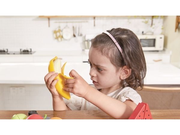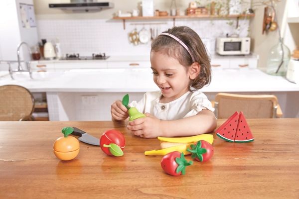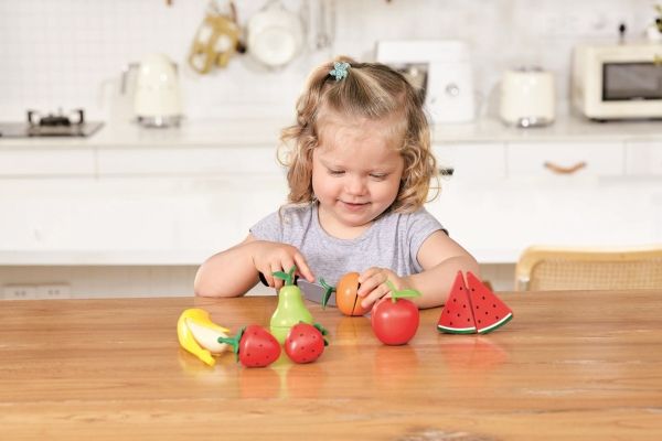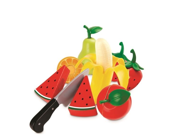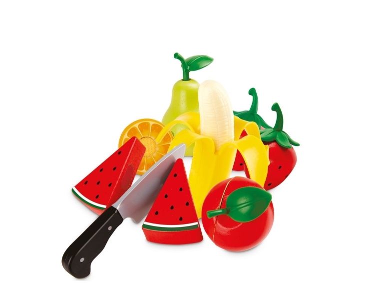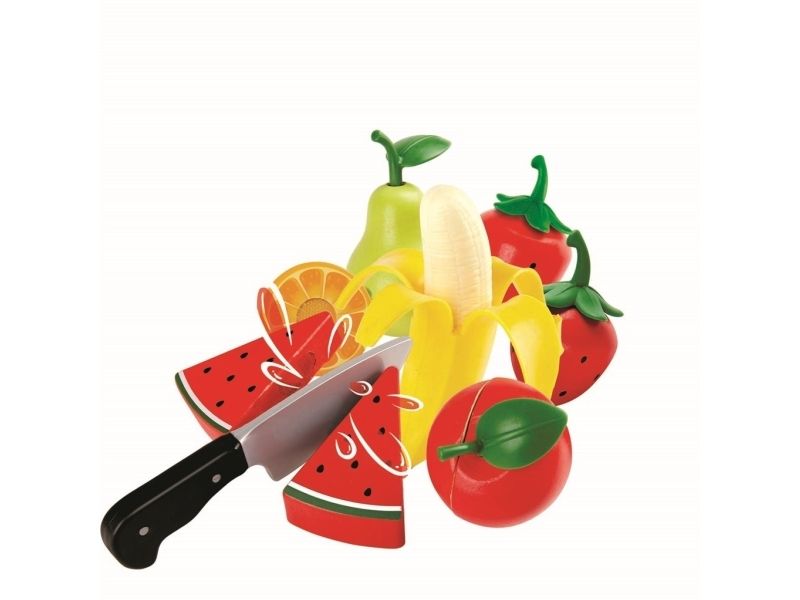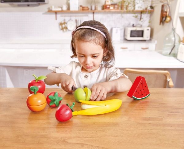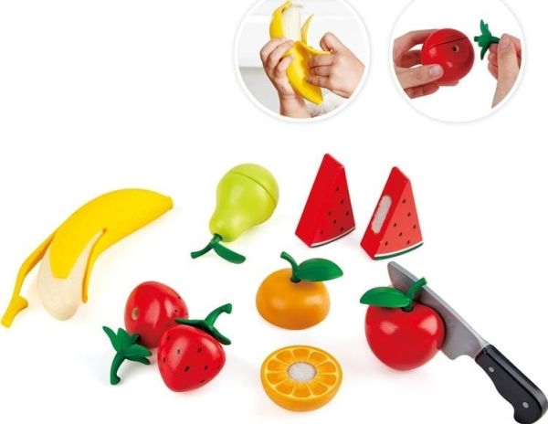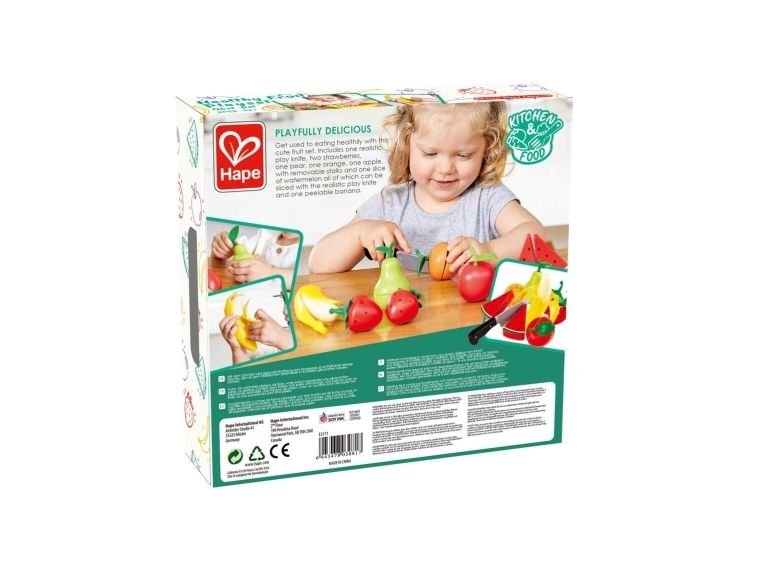 Væn dig til at spise sundt med dette skønne Hape Sundt Frugt Legesæt. Sættet indeholder to jordbær, en pære, en appelsin, et æble, en skive vandmelon, en banan og en realistisk udseende legekniv. Bananen kan skrælles som en rigtig banan, mens æble, pære, appelsin og jordbær har stilke der kan fjernes. Skær i pæren, appelsinen og vandmelonen med legekniven. Med glatte afrundede hjørner der er rigtig gode til udvikling af finmotorik, sprog og sociale færdigheder. Indeholder i alt 9 dele.