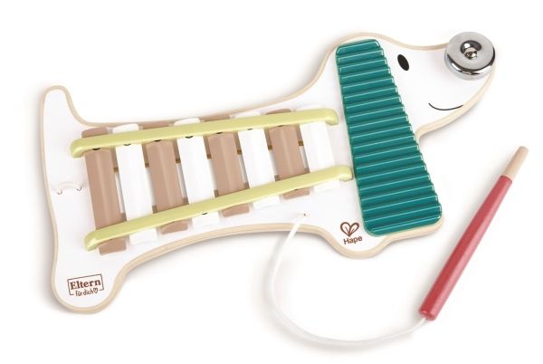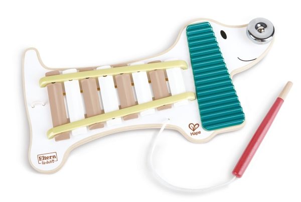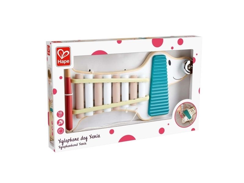Xenia er en meget speciel hund, da du kan spille musik med hende. På Hape Xylophone Hund Xenia kan de små musikere spille på xylofon, guiro og klokke. På denne måde, hjælper Xenia til barnets musikalske udvikling, fremmer rytmisk sans og udvikler motoriske evner.