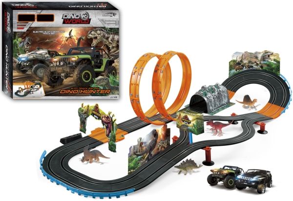 Fed racerbane fra JJ Slot.  Denne Racerbane indeholder 2 seje racerbiler, en bil i grøn og en bil i sand-farvet Med denne cool dino Racerbane, kan du konkurrerer mod dine venner, om hvem der er den hurtigste. Mærk spændingen i fingrene når du kører gennem de 2 store lup og få følelsen af glæden, når du kører over målstregen.