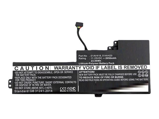 Discover the trusted quality of CoreParts with our Top Quality replacement Laptop Battery for Lenovo 23Wh Li-Pol 11.25V 2050mAh Black, ThinkPad T470, ThinkPad T470 20HD002TCD, ThinkPad T470 20HDA003CD. Engineered to deliver unmatched performance, this 23.06 Wh battery ensures that your device remains powered and ready for all your demands. Produced in China with rigorous quality control, each component meets high standards for reliability and longevity. Backed by a 12 Month(s) warranty, CoreParts products offer you confidence in every use, knowing you're investing in sustainability and cost efficiency. Our easy-to-install parts help you avoid costly replacements, empowering you to extend the life of your devices, reduce e-waste, and support a greener future. Choose CoreParts for high-quality, value-driven solutions that stand up to daily use and deliver ongoing reliability.