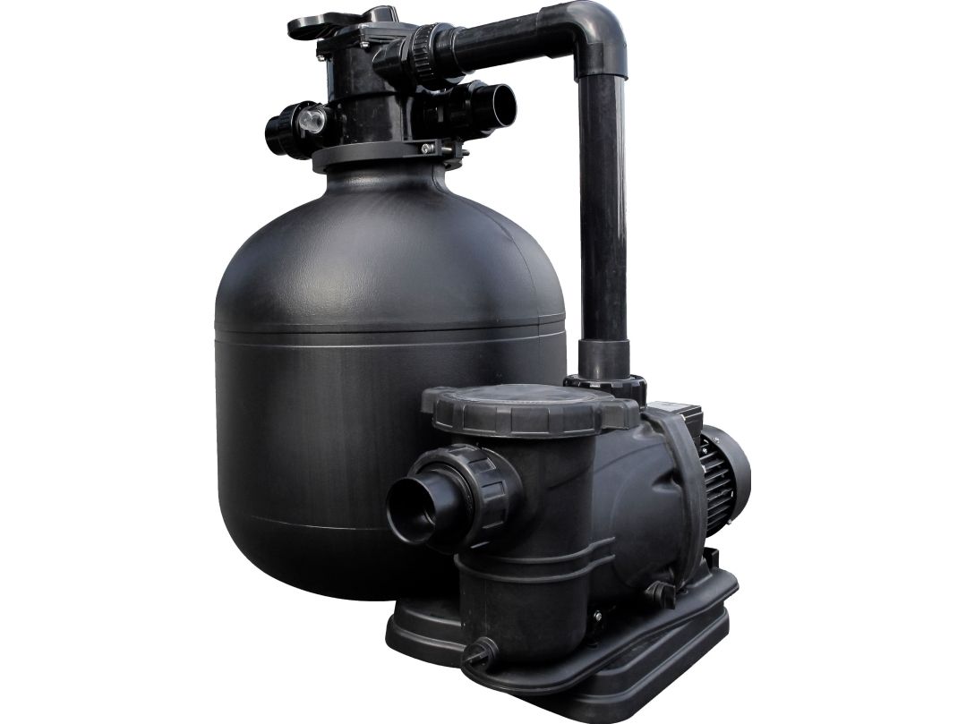 Filtersystemet består av en filtertank i værbestandig materiale og en kraftig selvsugende pumpe, som monteres på den medfølgende monteringsplattformen. Pumpen er utstyrt med grovfilter, som er en ekstra praktisk anordning når du skal gjennomføre backwash (returskylling og rensing av filtermaterialet). Tydelige instruksjoner på toppventilen gjør det enkelt å bruke systemet, og driftstrykket i tanken leses enkelt av på det integrerte manometeret.
