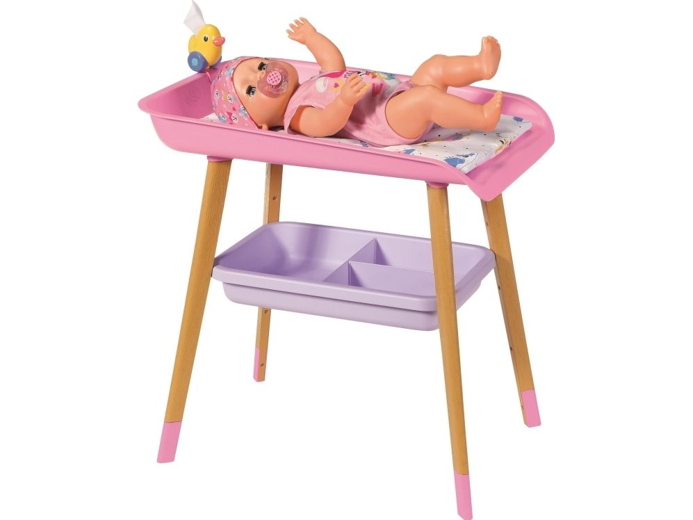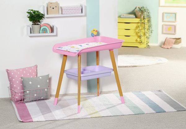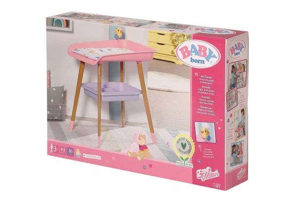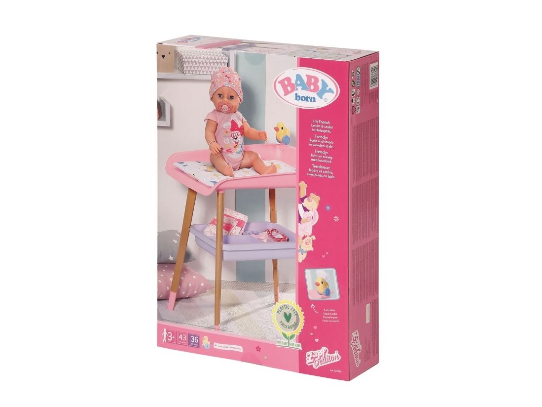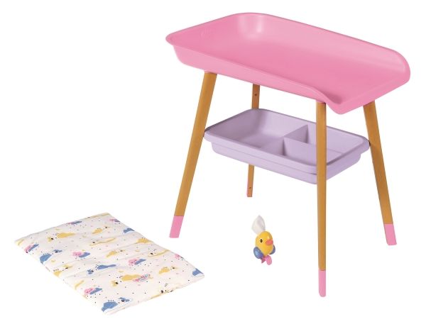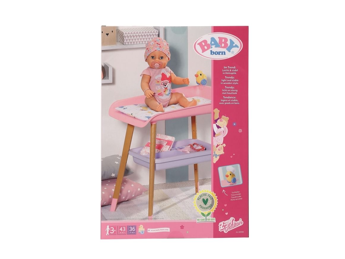 Stellebord med ekstra oppbevaring av babypleie-elementer. Satt bleien på feil? Det kan ikke skje med BABY born stellebordet. Bordet i Skandinavisk design har ben i design av tre og passer godt sammen med den høye stolen og klesstativet. Mens BABY born ligger på den myke stellematten passer hun på av Anden Berta som sørger for trøst og våtservietter under bleieskiftet. Nye bleier, klær og leker kan oppbevares i de 3 oppbevaringsrommene under stellematten. Passer også til mindre dukker. Tilbehør av høyeste kvalitet til BABY born dukken. For forbedret, mangfoldig og langvarig moro gjennom lek. Fra 3 år. Inkluderer: - BABY born stellebord med aftakbar oppbevaringshylle