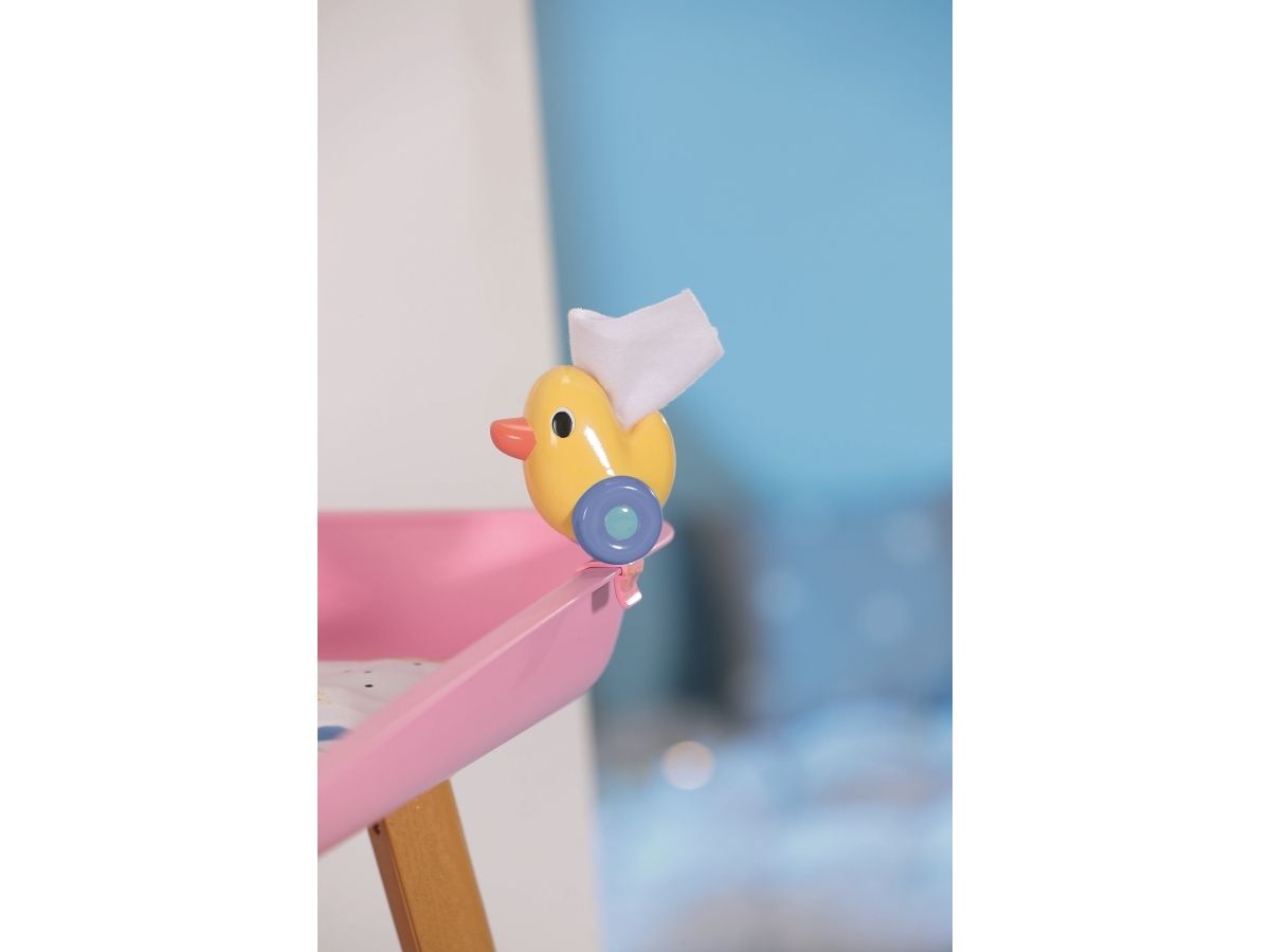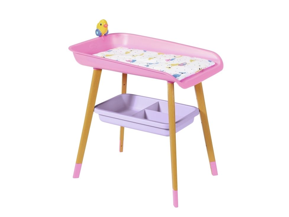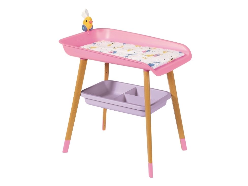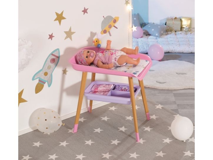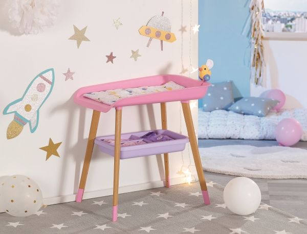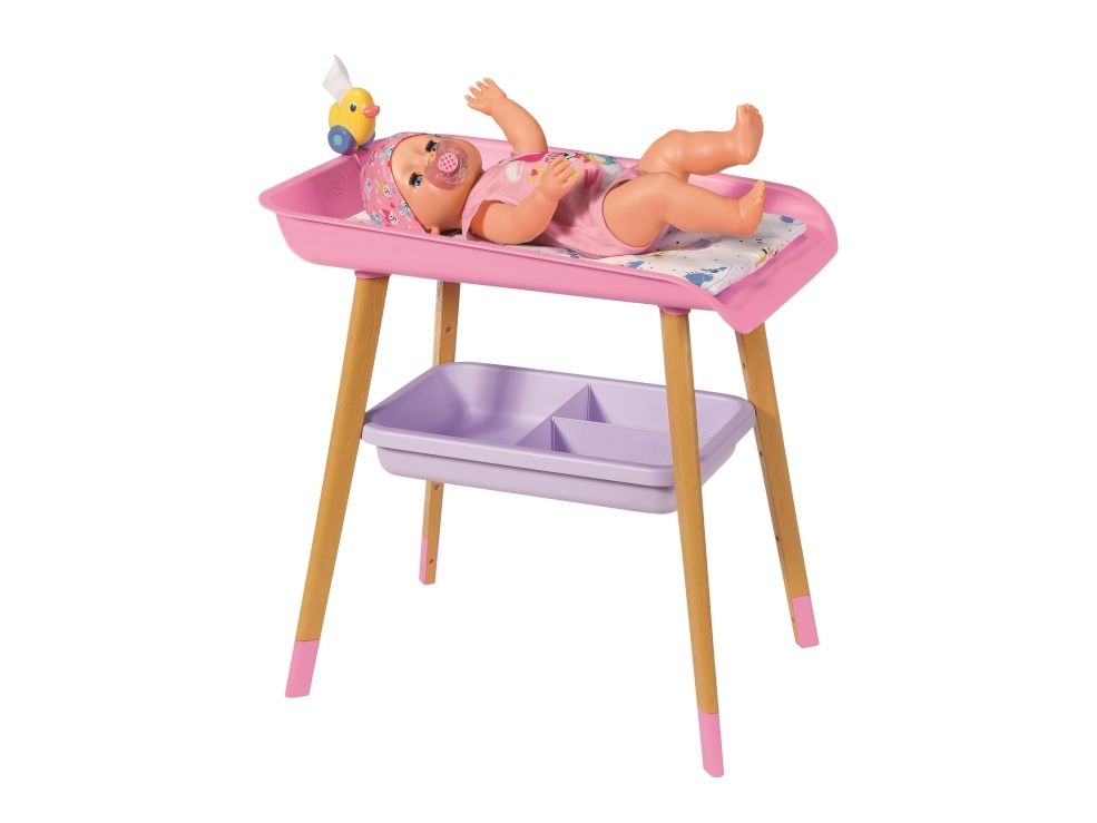 Stellebord med ekstra oppbevaring av babypleie-elementer. Satt bleien på feil? Det kan ikke skje med BABY born stellebordet. Bordet i Skandinavisk design har ben i design av tre og passer godt sammen med den høye stolen og klesstativet. Mens BABY born ligger på den myke stellematten passer hun på av Anden Berta som sørger for trøst og våtservietter under bleieskiftet. Nye bleier, klær og leker kan oppbevares i de 3 oppbevaringsrommene under stellematten. Passer også til mindre dukker. Tilbehør av høyeste kvalitet til BABY born dukken. For forbedret, mangfoldig og langvarig moro gjennom lek. Fra 3 år. Inkluderer: - BABY born stellebord med aftakbar oppbevaringshylle