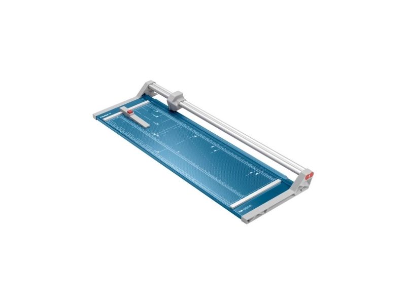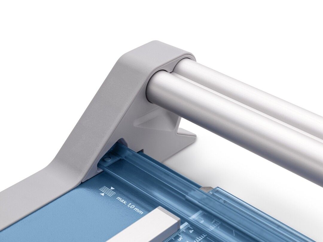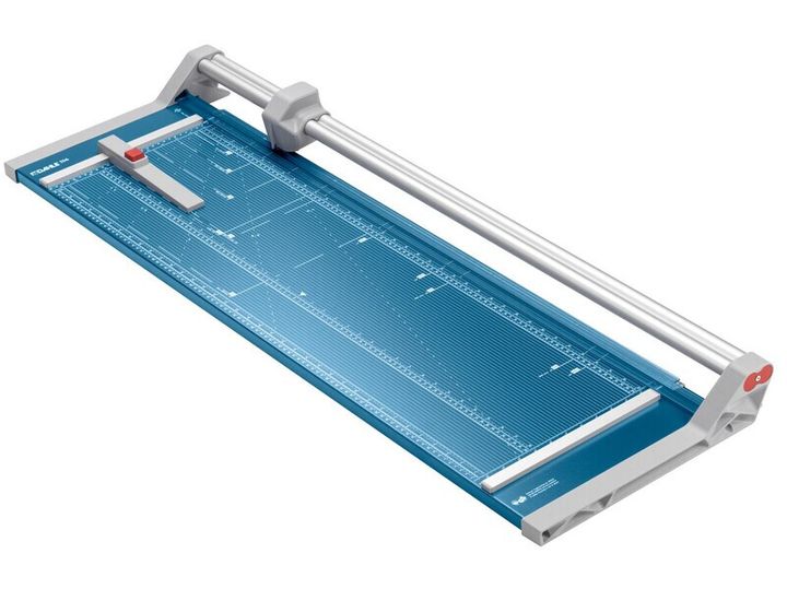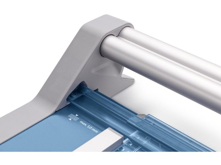 - Helpful format lines on the base with mm division along the cutting edge make aligning the material to be cut even easier - Stable metal base with non-slip rubber feet to keep the rotary trimmer securely in place - Automatic clamping on the cutting line to quickly fix in place the material to be cut - Convenient rotary trimmer for professional use - Double guide bar for absolutely accurate cutting - Self-sharpening steel rotary blade enclosed in safety cutting head, ground and hardened - Ground lower blade of hardened steel - Rotary blade in closed, ergonomic plastic head - Two scale bars - Adjustable backstop for quickly finding the right format - Rear feet for space-saving upright storage - High-quality blade made from hardened steel for long-lasting cutting quality