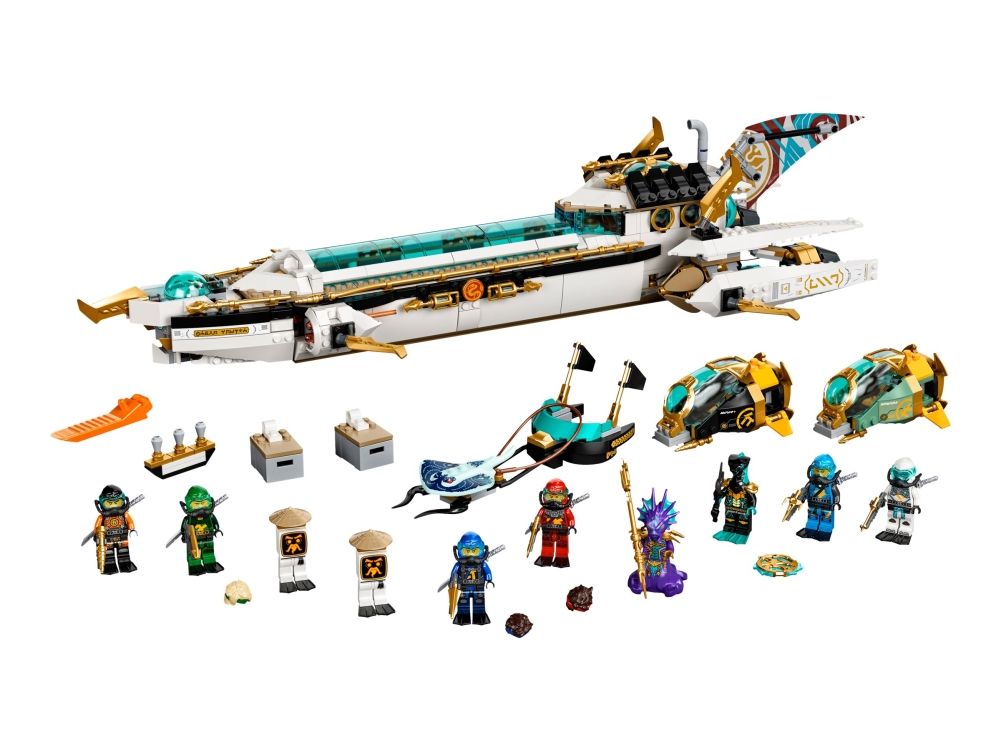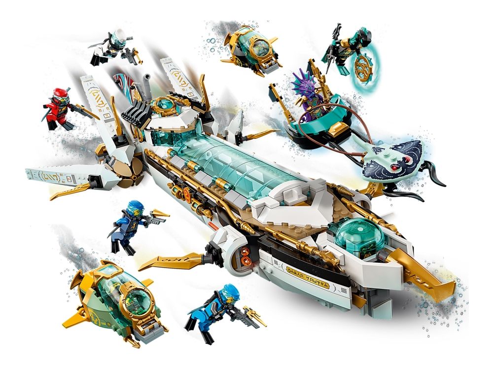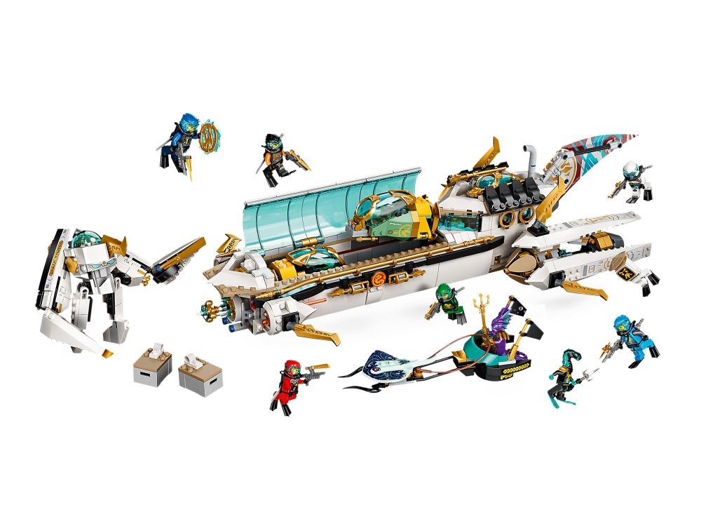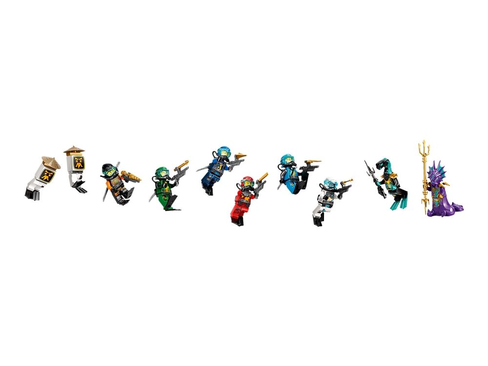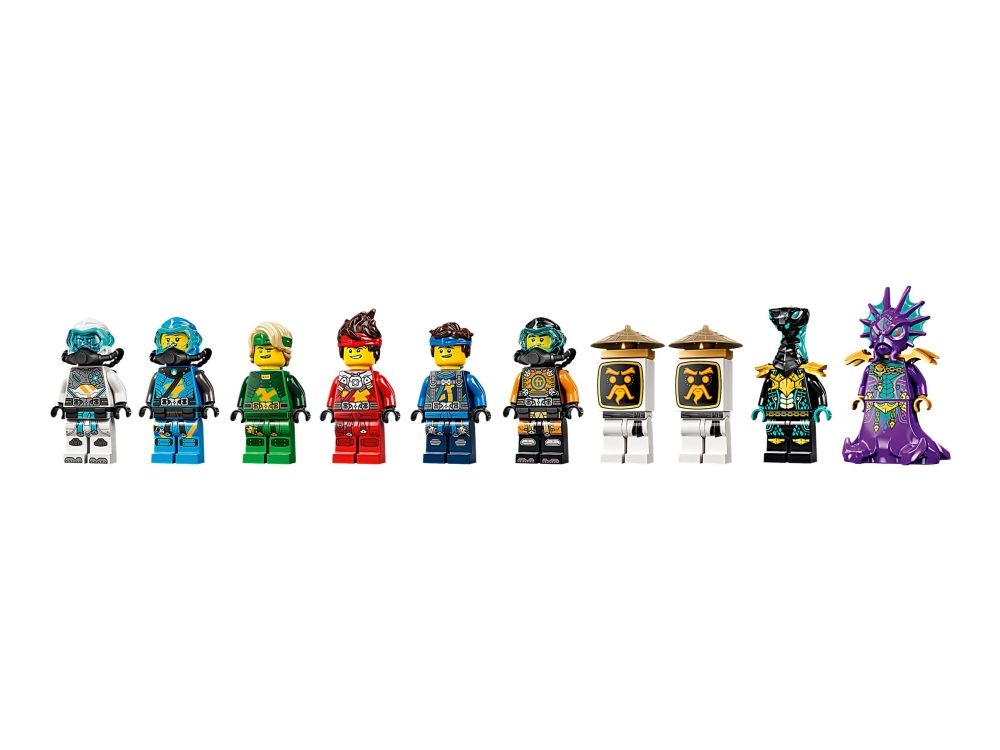 Inkluderer ti minifigurer fra TV-serien NINJAGO®: Seabound: Scuba-Kai, Scuba-Cole, Scuba-Jay, Scuba-Lloyd, Scuba-Zane og Scuba-Nya, prins Kalmaar, en Maaray-vakt og to Wu Bots.