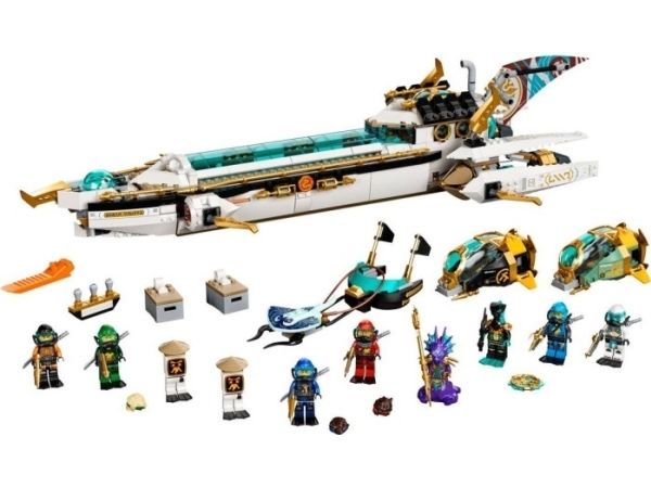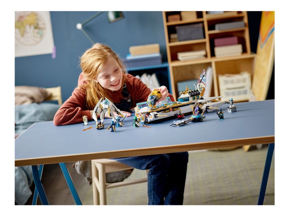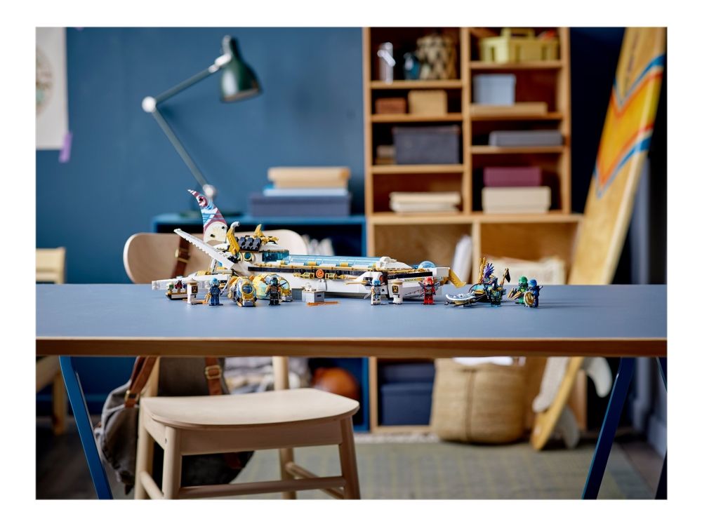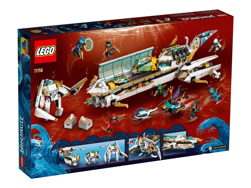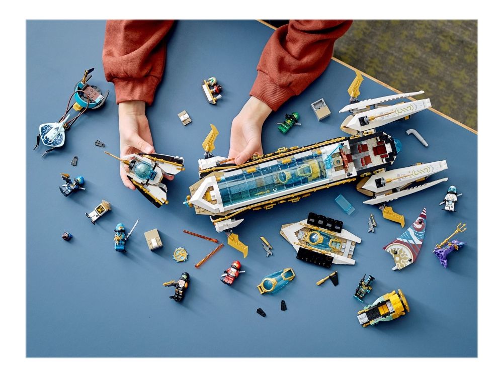 Inkluderer ti minifigurer fra TV-serien NINJAGO®: Seabound: Scuba-Kai, Scuba-Cole, Scuba-Jay, Scuba-Lloyd, Scuba-Zane og Scuba-Nya, prins Kalmaar, en Maaray-vakt og to Wu Bots.