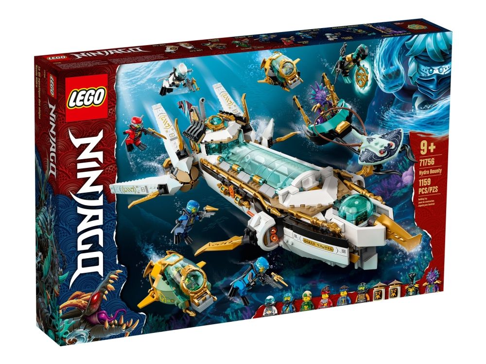 Dette svært detaljerte LEGO® NINJAGO® Hydro Bounty (71756) lekesettet lar barn delta i intense kamper på havbunnen. Undervannsfartøyet leveres med ti minifigurer og er spekket med tøffe funksjoner – to fjærbelastede skytere, cockpit som kan åpnes, vinger som kan foldes ut og inn, en avtakbar robot og to miniubåter, alt for å sette fantasien til unge ninja-fans i sving!Førsteklasses NINJAGO lekesettUndervannslekesettet har hele ti minifigurer: Scuba-Kai, Scuba-Nya, Scuba-Zane, Scuba-Jay, Scuba-Cole og Scuba- Lloyd, alle med svømmeføtter, dykkeutstyr og våpen så de kan bekjempe kjeltringbanden bestående av prins Kalmaar, en Maaray-vakt og to Wu Bots.Gøyale byggesett som stimulerer barns fantasiNINJAGO leker tar barn med inn i en fascinerende og spennende fantasiverden. Unge byggere kan kose seg mens de setter sammen de unike lekemodellene før de kaster seg ut i engasjerende eventyr med ninjaheltene sine for å bekjempe en skare kjeltringer ved hjelp av en imponerende blanding av fly, drager og roboter.