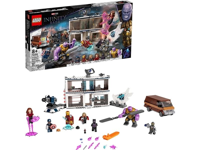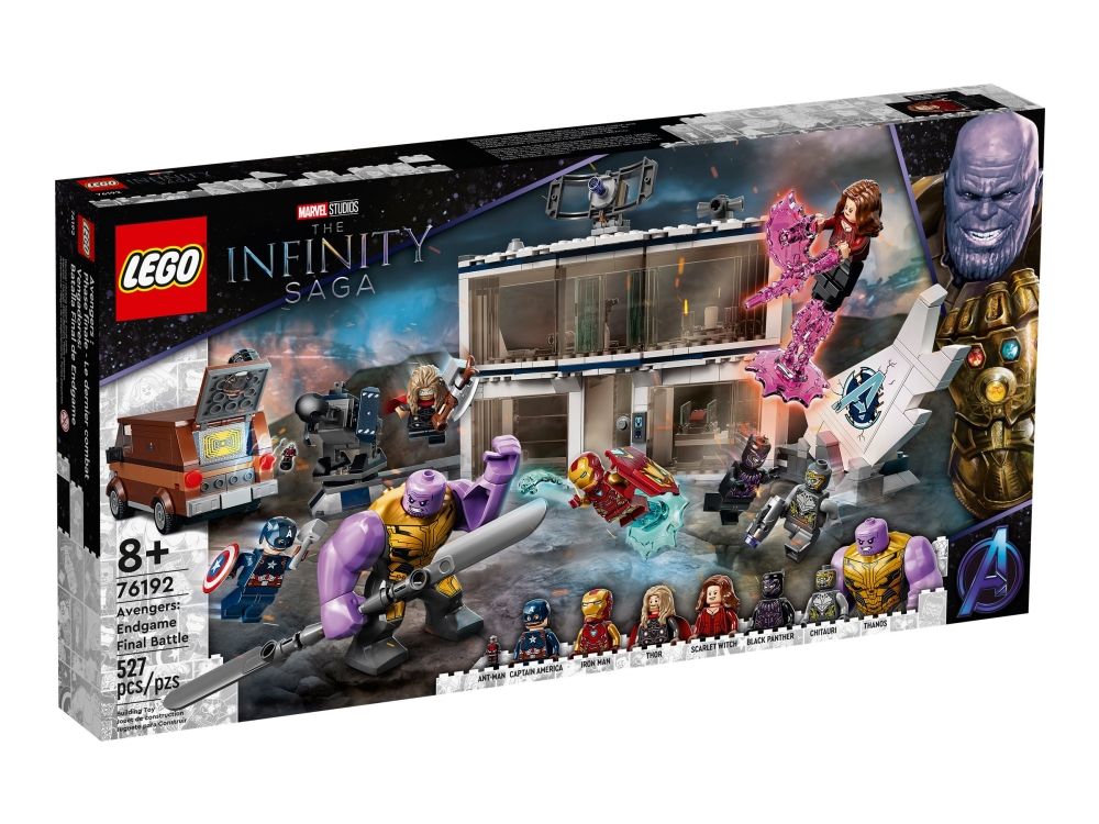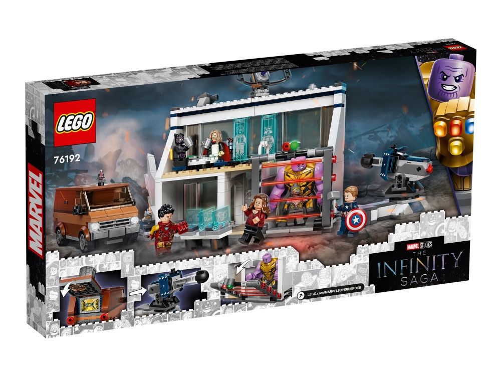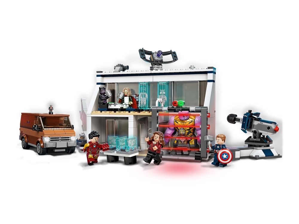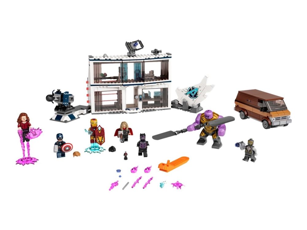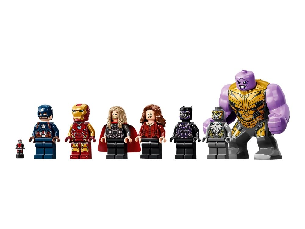 Inkluderer minifigurer av Thor, Captain America, Black Panther, Iron Man, Scarlet Witch og en Chitauri-kriger samt en figur av Thanos og en mikrofigur av Ant-Man.