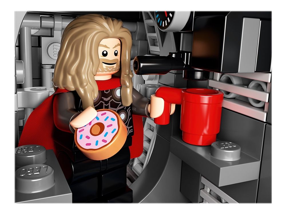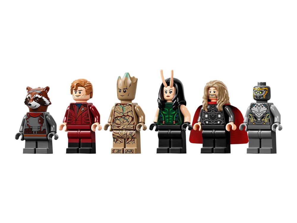 Inkluderer LEGO® minifigurer av Stjerneherren, Groot, Rakett, Mantis, Thor og Chitauri-kriger samt kule våpen og tilbehørselementer.