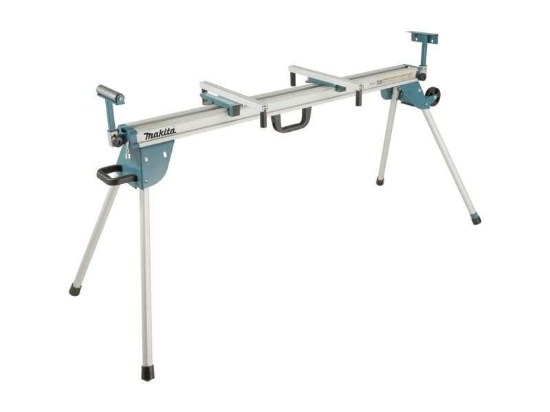 The Makita Folding Miter Saw Stand supports your Makita Miter Saw for easier material cutting. Made of aluminum, the stand weighs just under 40 lbs. for job site portability. Large rubber wheels and a side handle allows the stand to be transported around the job site. Folding legs provide compact storage. When folded, a carrying handle allows the user to single-handedly transport the stand.