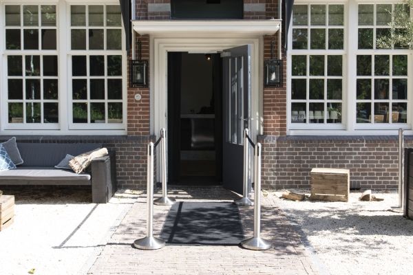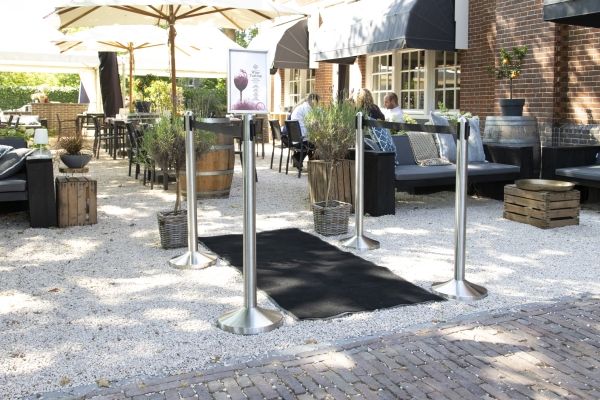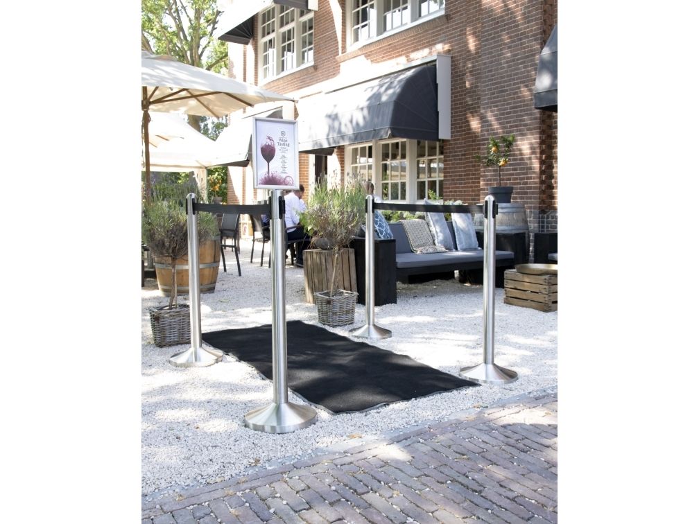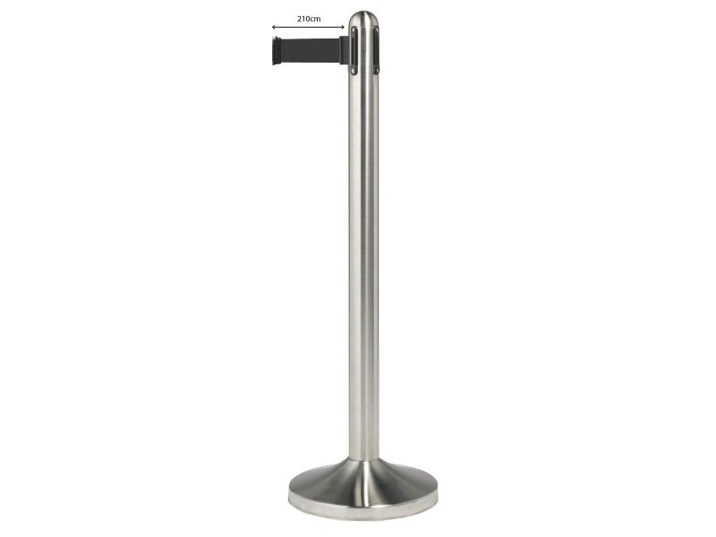 En perfekt måde at guide dine kunder gennem områder med høj trafik Børstet rustfrit stål, sorte detaljer, flade toppe og gulvbeskyttelse Integreret 2 meter udtrækbart nylonbånd Inkluderer et firevejs forbindelsespunkt Vejrbestandig