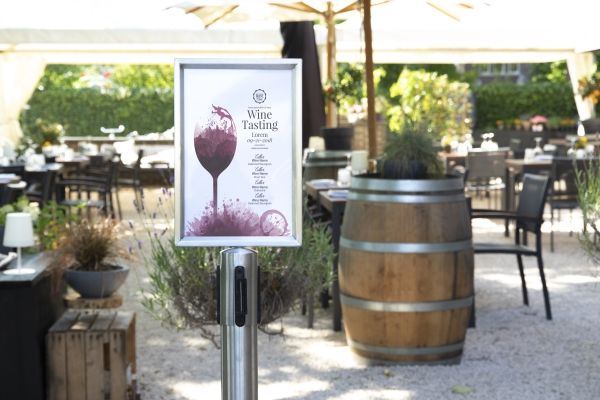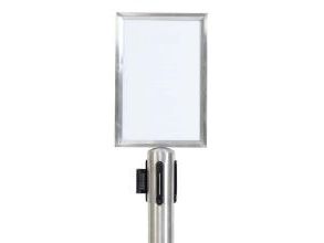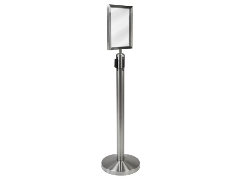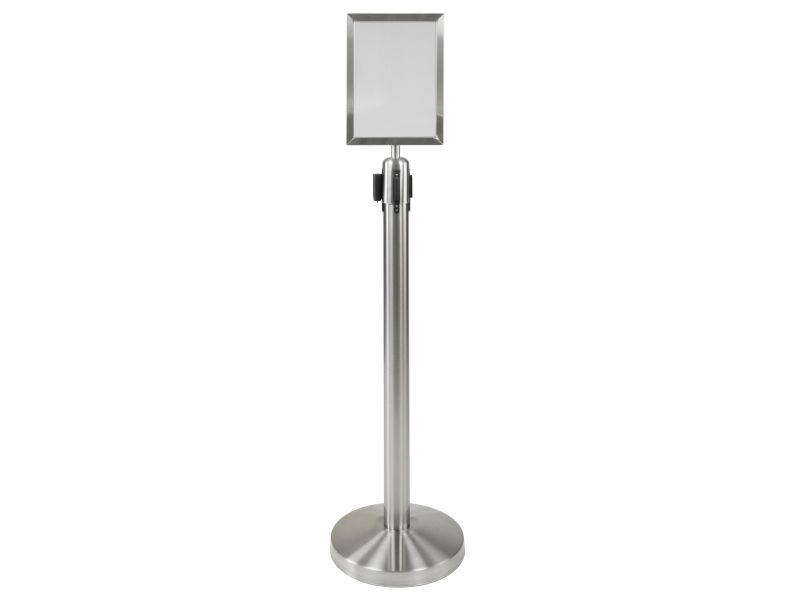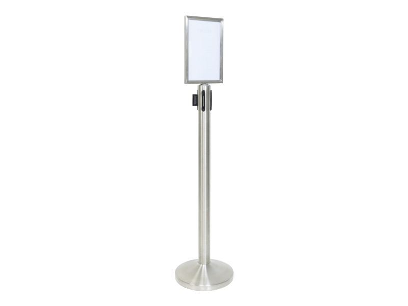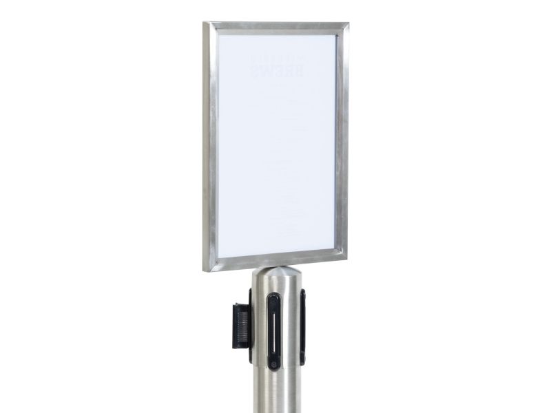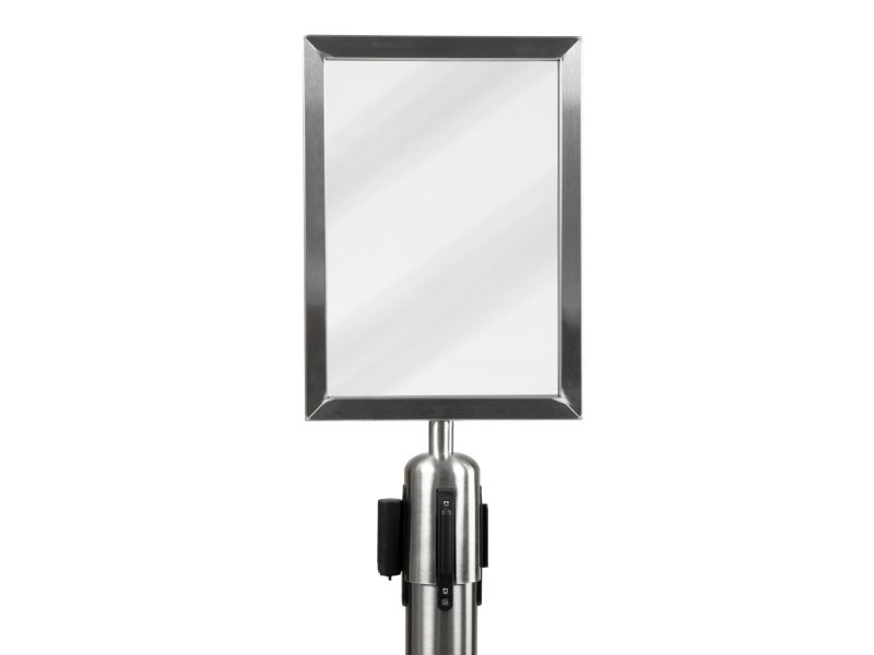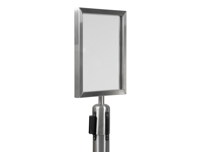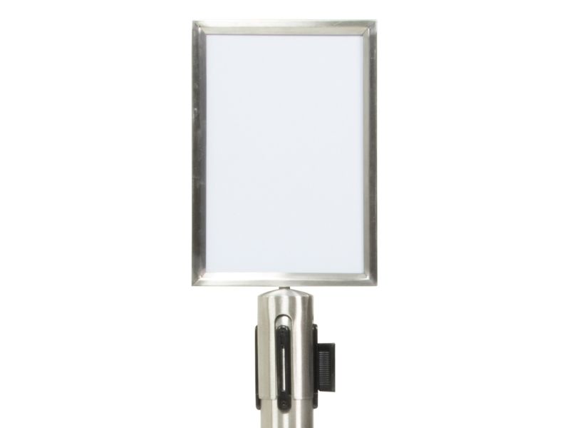 A4-Topskilt Børstet rustfrit stål Vejrbestandig Nemt at indsætte dit skilt Fastgør Topskilten på Securit®-udtrækkelig afspærringsstolpe