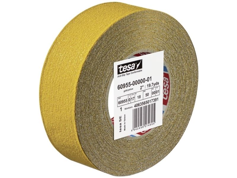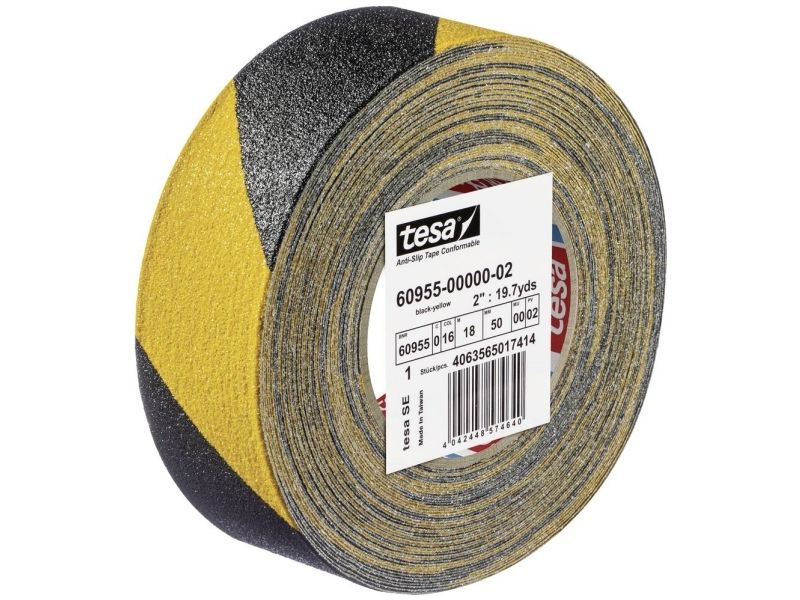 tesa® anti-skrid-tape comfortable - skridsikkert tape til uregelmæssige overflader, selvklæbende på den ene side - 18 m x 50 mm - sort-gul Udviklet til anvendelse på uregelmæssige overflader: Giver pålidelig vedhæftning på trinplader, stiger, læsseramper og platforme - også flader med skruehoveder eller nitter bliver trædefastFleksibilitet og skridsikkerhed: Den robuste holder i aluminium giver en høj tilpasningsevne, for eksempel i hjørner og kanter - belægning med mineralpartikler for godt greb og sikker standEnsidet skridsikker tape med høj bestandighed: 700 µm tyk Dick - god bestandig over for kemikalier og vejrforholdHøj signalvirkning for optimeret sikkerhed: Skinnende gul og sort-gule striber sørger for god synlighed med dette skridsikre båndCertifikat iht. tysk industristandard: Skridsikker certificering R13 iht. din 51130 - hæfter på de fleste overflader - klarer temperaturer op til 120 °C. tesa anti-skrid-tape comfortable er specielt udviklet til brug på uregelmæssige overflader. Den giver især på trædeflader, ledere, læsseramper og platforme fremragende vejgreb. Også flader med skruehoveder eller nitter bliver så trædefast. Ud over den høje skridsikkerhed har båndet også den nødvendige fleksibilitet. Dette skyldes den robuste holder i aluminium - denne kan endda tilpasses hjørner og kanter. Sikker stand og godt greb opnås med belægning med mineralpartikler. Vigtigt: Den lysende gul giver optimal synlighed og dermed en ekstra sikkerhed. Båndet hæfter på de fleste almindelige overflader og holder temperaturer op til 120 °C. Den har desuden en skridsikker certificering R13 iht. din 51130. tesa har altså også den rigtige løsning til krævende anvendelsesområder.tesa - mere end blot en tapetesa er en af verdens førende producenter af tape og tape og klæbesystemløsninger og står for produkter af høj kvalitet. I mere end 125 år har den tyske virksomhed udviklet løsninger til mange forskellige anvendelser på kontoret, i hjemmet og i haven, men også inden for bil- og elektronikindustrien. tesa-husholdninger tilbyder flere hundrede løsninger omkring hjemmet, fastgørelse, montering, pakning, renovering, reparation, Isolerer eller beskytter mod insekter, støv og træk.