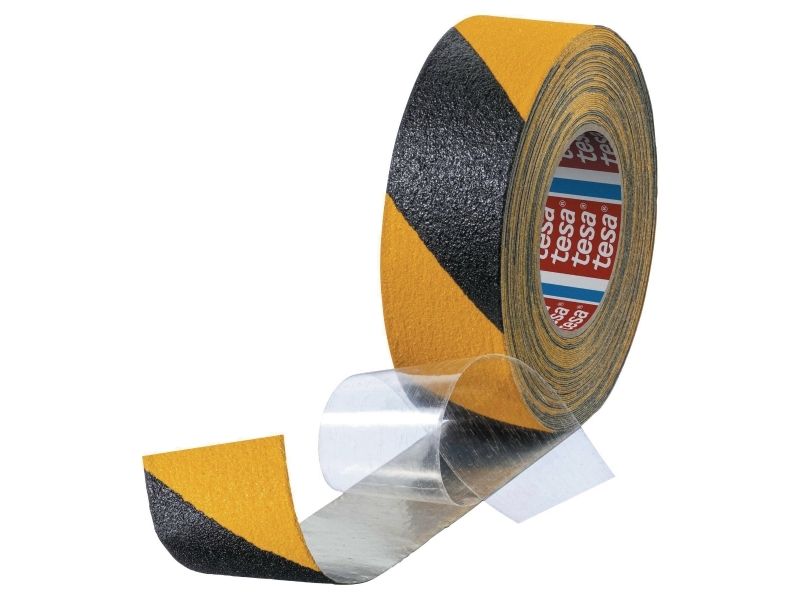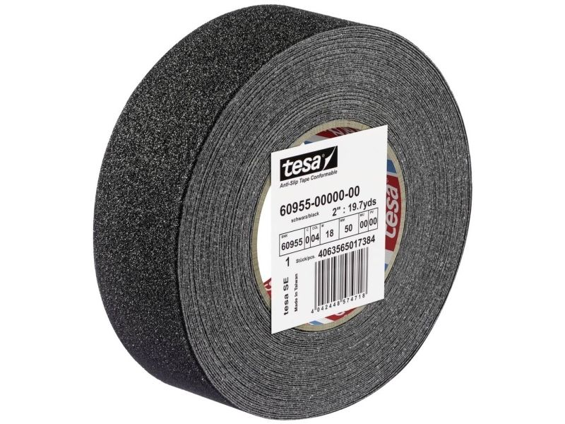 tesa® anti-skrid-tape comfortable - skridsikkert tape til uregelmæssige overflader, selvklæbende på den ene side - 18 m x 50 mm - sort Udviklet til anvendelse på uregelmæssige overflader: Giver pålidelig vedhæftning på trinplader, stiger, læsseramper og platforme - også flader med skruehoveder eller nitter bliver trædefastFleksibilitet og skridsikkerhed: Den robuste holder i aluminium giver en høj tilpasningsevne, for eksempel i hjørner og kanter - belægning med mineralpartikler for godt greb og sikker standEnsidet skridsikker tape med høj bestandighed: 700 µm tyk Dick - god bestandig over for kemikalier og vejrforholdHøj signalvirkning for optimeret sikkerhed: Skinnende gul og sort-gule striber sørger for god synlighed med dette skridsikre båndCertifikat iht. tysk industristandard: Skridsikker certificering R13 iht. din 51130 - hæfter på de fleste overflader - klarer temperaturer op til 120 °C. tesa anti-skrid-tape comfortable er specielt udviklet til brug på uregelmæssige overflader. Den giver især på trædeflader, ledere, læsseramper og platforme fremragende vejgreb. Også flader med skruehoveder eller nitter bliver så trædefast. Ud over den høje skridsikkerhed har båndet også den nødvendige fleksibilitet. Dette skyldes den robuste holder i aluminium - denne kan endda tilpasses hjørner og kanter. Sikker stand og godt greb opnås med belægning med mineralpartikler. Vigtigt: Den lysende gul giver optimal synlighed og dermed en ekstra sikkerhed. Båndet hæfter på de fleste almindelige overflader og holder temperaturer op til 120 °C. Den har desuden en skridsikker certificering R13 iht. din 51130. tesa har altså også den rigtige løsning til krævende anvendelsesområder.tesa - mere end blot en tapetesa er en af verdens førende producenter af tape og tape og klæbesystemløsninger og står for produkter af høj kvalitet. I mere end 125 år har den tyske virksomhed udviklet løsninger til mange forskellige anvendelser på kontoret, i hjemmet og i haven, men også inden for bil- og elektronikindustrien. tesa-husholdninger tilbyder flere hundrede løsninger omkring hjemmet, fastgørelse, montering, pakning, renovering, reparation, Isolerer eller beskytter mod insekter, støv og træk.