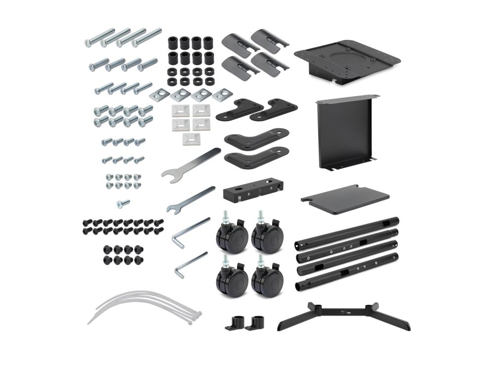4 x M5x14-skruer, 4 x M6x14-skruer, 4 x M6x30-skruer, 4 x M8x30-skruer, 4 x pakninger, 8 x avstandsstykker (små), umbrakonøkkel (4 mm), 4 x M8x50-skruer, M6-skiftenøkkel, sokkel, 16 x M6x12-skruer, 4 x låsetrinser, 2 x sokkelsøyler, 2 x øvre søyler, utstyrshylle, 4 x kabeldeksler, 5 x kabelklips og -holdere, avstandsstykke (stort), frontbøyledeksel, VESA-monteringsplate, 2 hyllebøyler, M6x18-skrue, 8 x M8x8 skruer, 2 x VESA-forlengelsesarmer (høyre), 2 x VESA-forlengelsesarmer (venstre), 8 x M6x8 skruer, 8 x M8x20-skruer, M10-skiftenøkkel, bakbøyledeksel, umbrakonøkkel (1,5 mm)