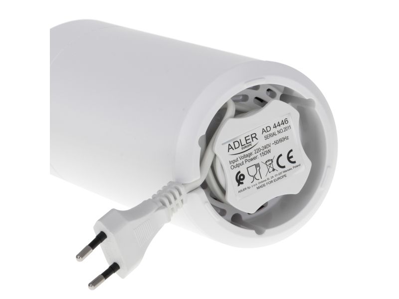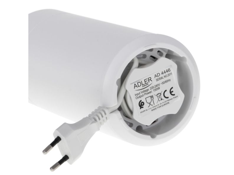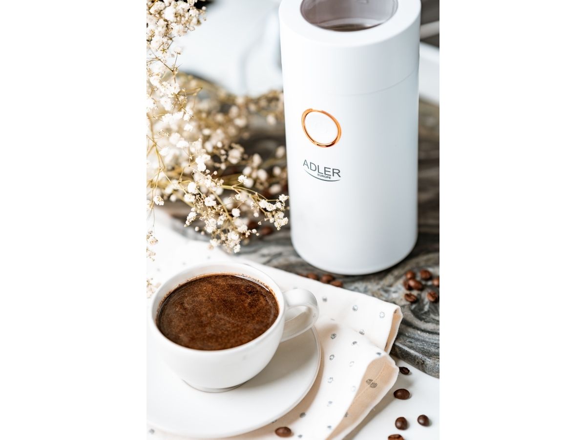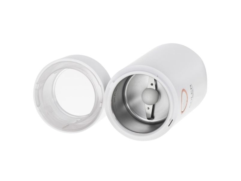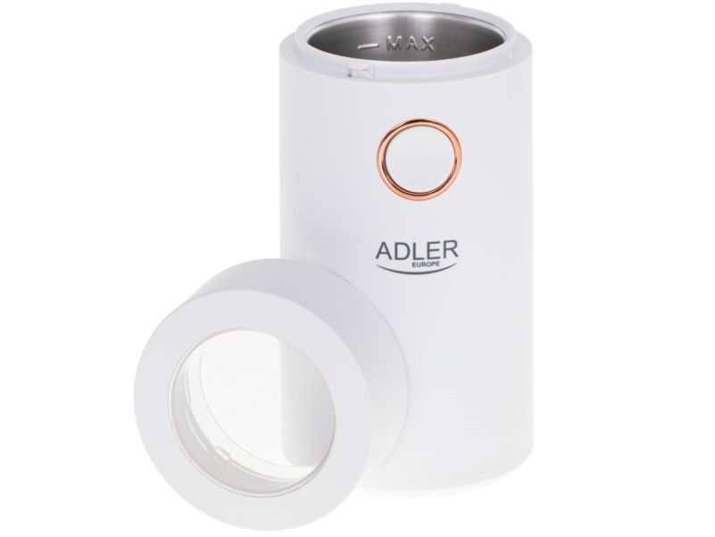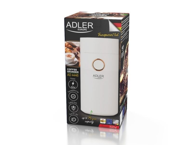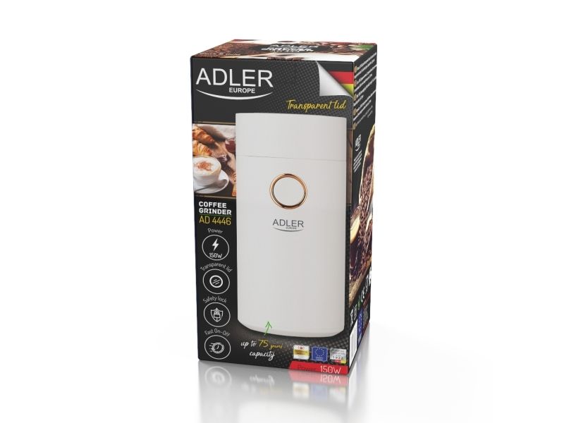 The AD 4446 coffee grinder is an indispensable kitchen equipment for people who appreciate the unique taste of coffee and cannot imagine a morning, an afternoon break at work or an evening meeting with friends without it. The grinder has a capacity of 75 g, so it allows you to grind the perfect amount of coffee so that it does not lose its aroma, it is equipped with an aroma-retaining cap to ensure the ground coffee can be used for several people. The maximum power of 150 W means that the coffee will be ground quickly without the need to grind the beans for a long time.Adler AD4446WG. Product type: Burr grinder, Coffee beans capacity: 75 g, Bowl material: Stainless steel. Power: 150 W, AC input voltage: 220-240 V, AC input frequency: 50-60 Hz. Weight: 720 g, Width: 96 mm, Depth: 96 mm. Package width: 100 mm, Package depth: 100 mm, Package height: 210 mm