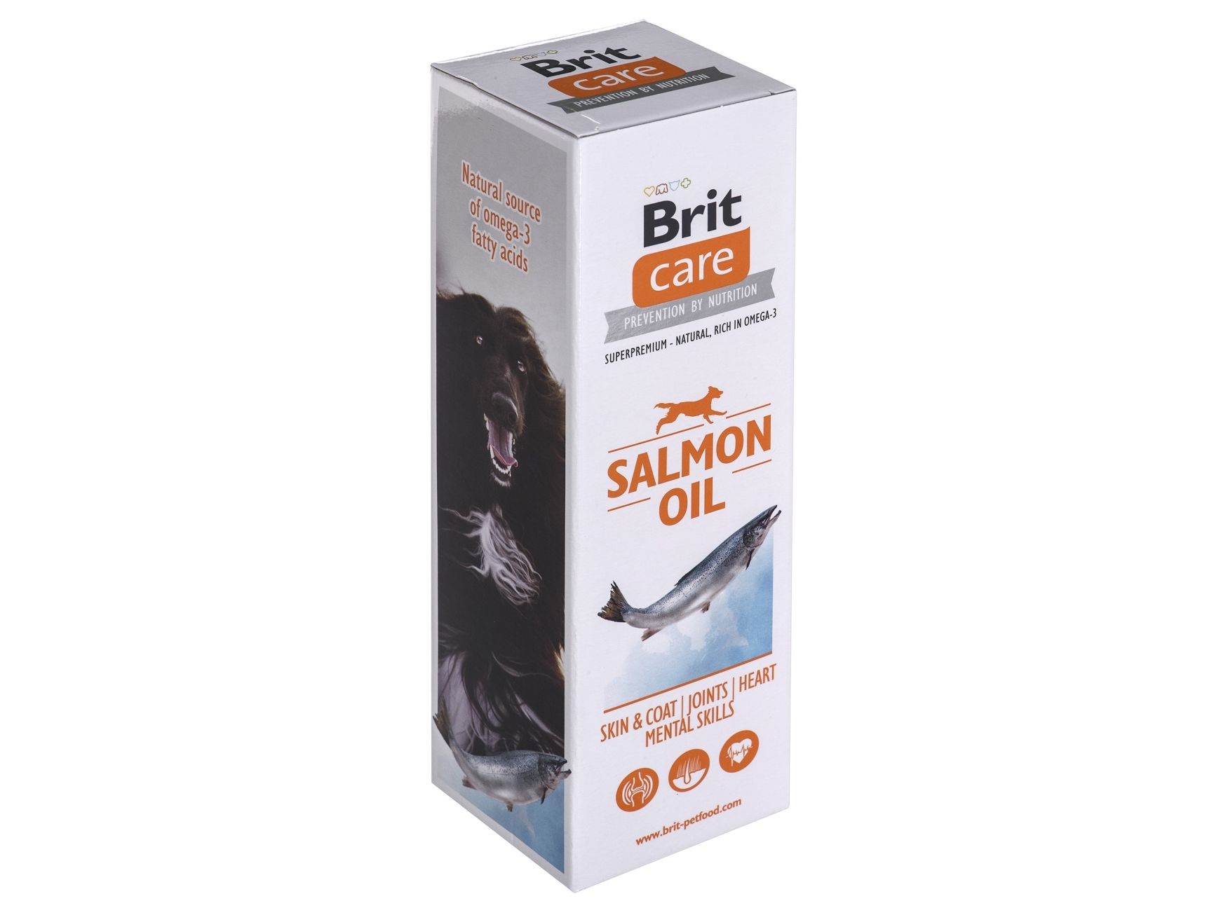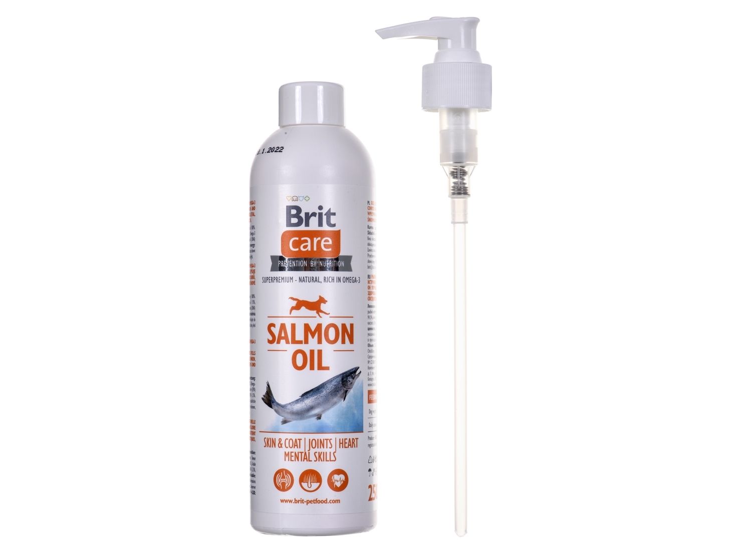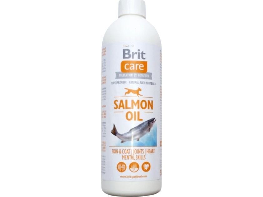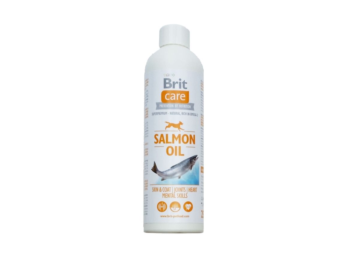PROPERTIES Salmon oil is a nutritional supplement for dogs. It is a perfect source of Omega 3 fatty acids (EPA and DHA) which have positive effect on many metabolic processes in an organism. EPA acid has natural anti-inflammatory effects, DHA acid participates at building of brain structures and retina. Salmon oil balances the ratio between Omega 3 and Omega 6 fatty acids and significantly reduces the amount of cholesterol in blood. With regular use of salmon oil, your dog´s hair will be dense and shiny.HELPS TO SOLVE CERTAIN HEALTH PROBLEMS: breakage and loss of hair, dull hair, dandruff, skin drying, thin hair, skin inflammation, skin itching, allergic reactions, bald spots, eczema, problems with pigmentation, immune system failures, problems with reproduction of both dog males and females.