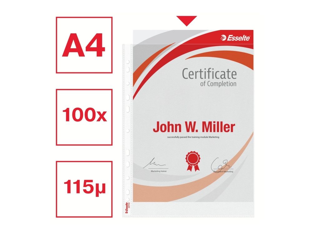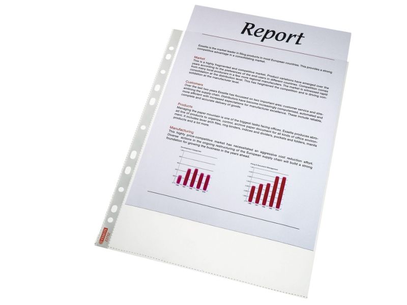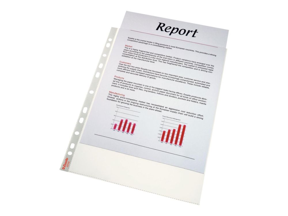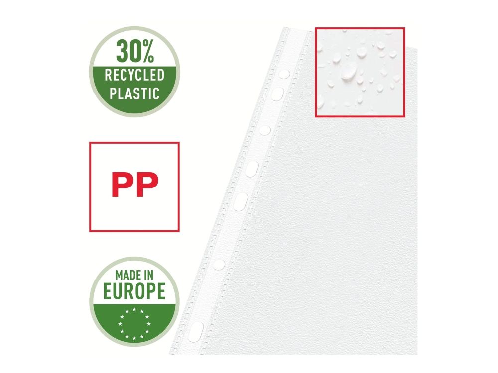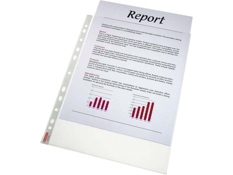 Førsteklasses lommer med en klar, mat finish, der er ideelle til daglig brug derhjemme, på kontoret eller i skolen. Den forstærkede strimmel med 11 huller gør det nemt at opbevare dokumenter i brevordnere og ringordnere og beskytter dem mod fugt, støv og snavs. Topåbning for nem adgang til dokumenter uden at løsne mappemekanismen. Copy safe og syrefrit materiale sikrer langvarig beskyttelse af dokumenterne. Fremstillet af PP-plast (polypropylen) med 30 % præ-consumer indhold, 100% recirkulerbar.