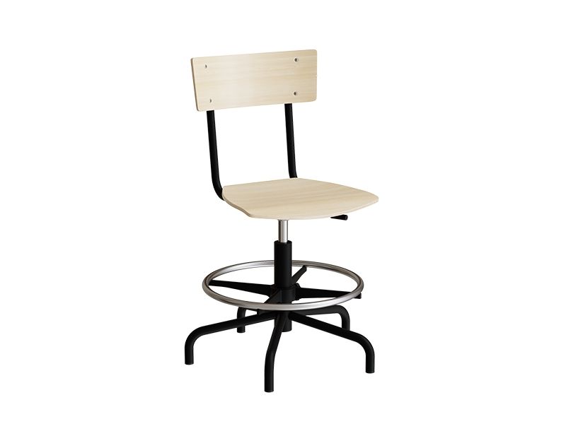 Stol Strong 113 med formpresset sæde og ryg, belagt med birk laminat. 5-fods kryds i plast med glidesko og fodring. Højden reguleres med gaslift og sædet er drejeligt. Passer godt som elevstol til folkeskole og videregående uddannelse samt sløjdlokaler.