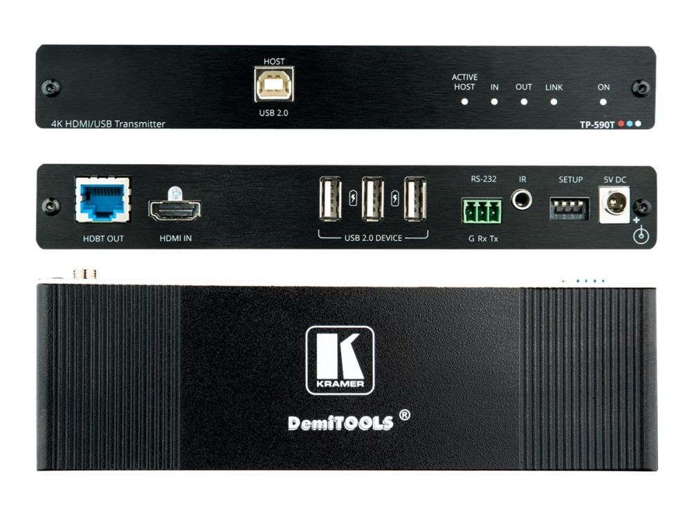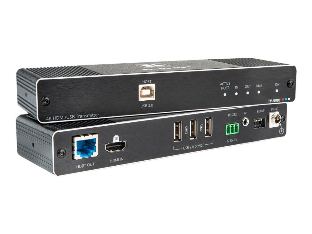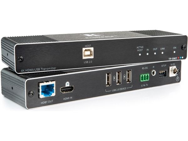 TP-590T is a high-performance, long-reach HDBaseT 2.0 transmitter for 4K60Hz (4:2:0) HDMI, USB, RS-232, and IR signals over twisted pair. TP-590T converts all input signals into the transmitted HDBaseT 2.0 signal. It extends considerably video signals over CAT copper cables at up to 4K at 60Hz (4:2:0) 24bpp video resolution and provides even further reach for lower HD video resolutions.