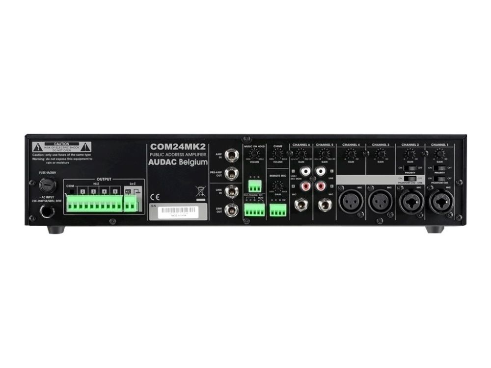 The COM series public address mixing amplifiers are providing an ideal solution for small to medium size commercial sound systems. Different configurations in terms of output power and connectivity provide enormous flexibility for numerous applications. The COM24 is capable of delivering an output power of 240 Watt to 100 Volt constant voltage systems or 4 Ohm low impedance loads. Six input channels with individual level control allow connectivity and mixing to a wide variation of music sources. Four balanced microphone inputs (XLR)containing phantom power (15V) and two priority allow connection for almost any (dynamic or condenser) microphone. Two inputs selectable between stereo unbalanced line (RCA) and microphone (6.3mm Jack) allow connection for any source such as CD-player, music computer or portable device, or enable to expand the total microphone count to 6. The remote microphone and tele-paging inputs allow expansion of the system with a paging station (with chime tones) or couple the system with your business telecom system (or any other priority line source). Using the priority mute contact, coupling and muting can be done through an external fire alarm system. The output level can be adjusted using a master volume control accompanied with 2-band tone regulation. The level is indicated with a 5-segment VU-bar while output selection is made possible using an integrated 5-zone speaker switcher. Both table-top installation or 19" (2HE) equipment rack mounting is made possible using the included adapters.