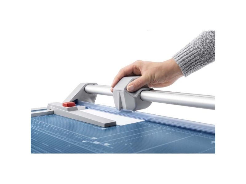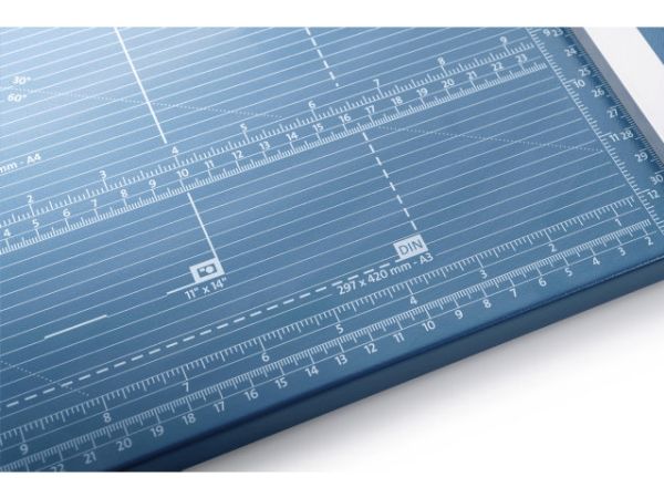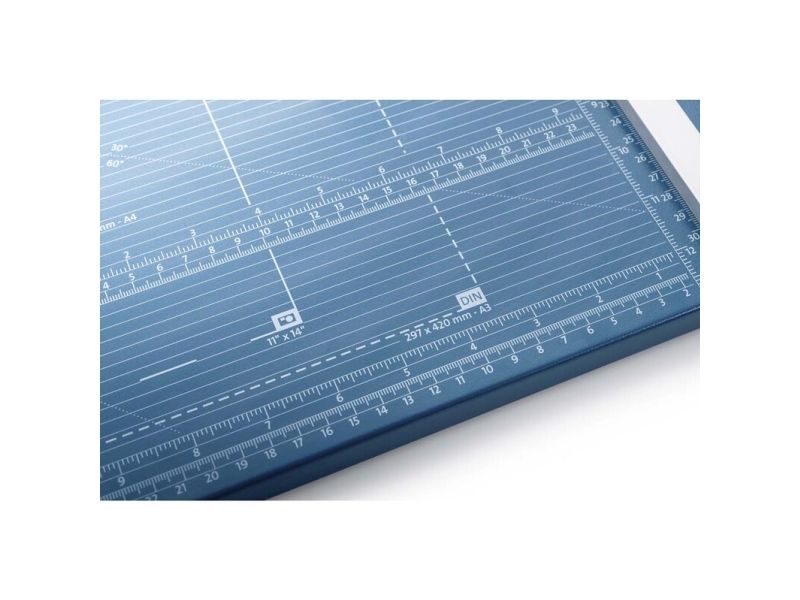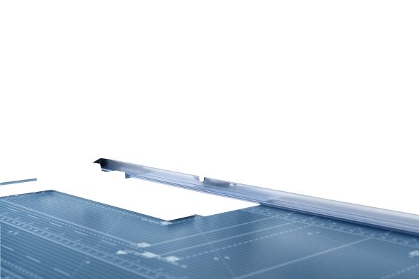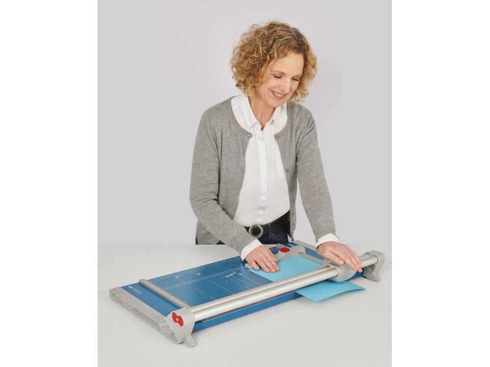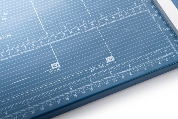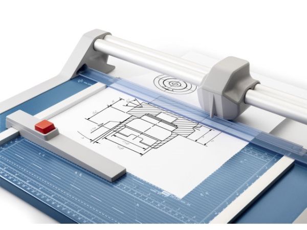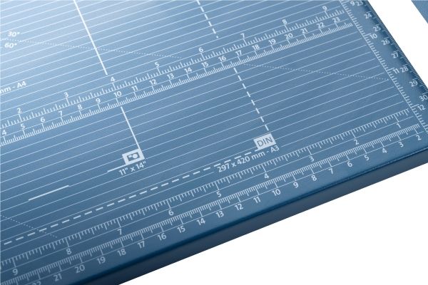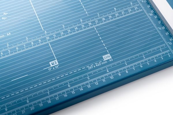 - Helpful format lines on the base with mm division along the cutting edge make aligning the material to be cut even easier - Stable metal base with non-slip rubber feet to keep the rotary trimmer securely in place - Automatic clamping on the cutting line to quickly fix in place the material to be cut - Convenient rotary trimmer for professional use - Double guide bar for absolutely accurate cutting - Self-sharpening steel rotary blade enclosed in safety cutting head, ground and hardened - Ground lower blade of hardened steel - Rotary blade in closed, ergonomic plastic head - Two scale bars - Adjustable backstop for quickly finding the right format - Rear feet for space-saving upright storage - High-quality blade made from hardened steel for long-lasting cutting quality