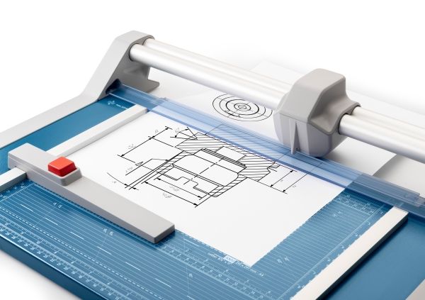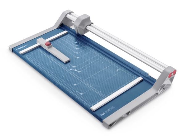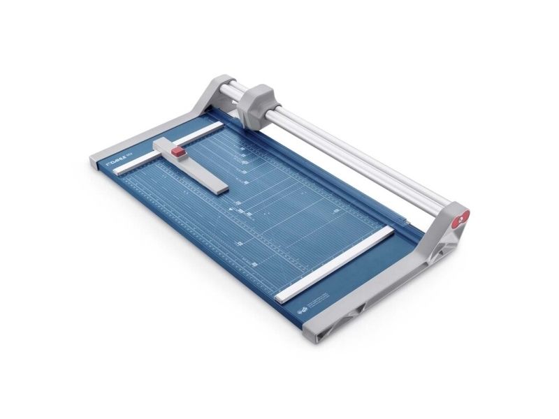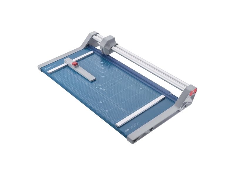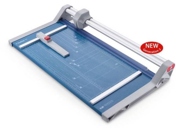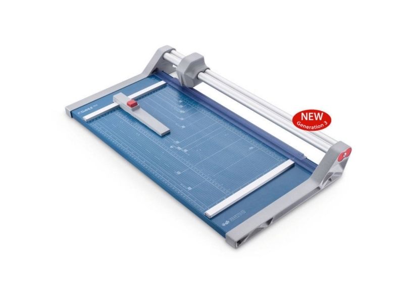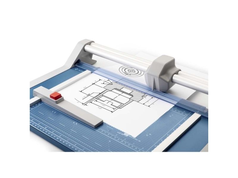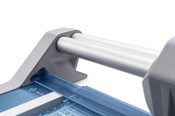 - Helpful format lines on the base with mm division along the cutting edge make aligning the material to be cut even easier - Stable metal base with non-slip rubber feet to keep the rotary trimmer securely in place - Automatic clamping on the cutting line to quickly fix in place the material to be cut - Convenient rotary trimmer for professional use - Double guide bar for absolutely accurate cutting - Self-sharpening steel rotary blade enclosed in safety cutting head, ground and hardened - Ground lower blade of hardened steel - Rotary blade in closed, ergonomic plastic head - Two scale bars - Adjustable backstop for quickly finding the right format - Rear feet for space-saving upright storage - High-quality blade made from hardened steel for long-lasting cutting quality