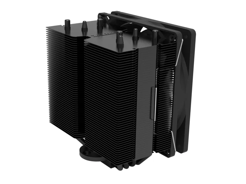Differentiated from typical U-shaped heatpipe coolers, a central band of rippled aluminum fins adds a sleek and cool aesthetic finish.