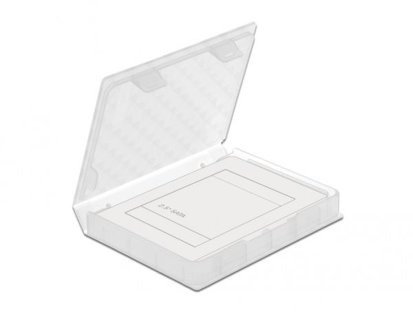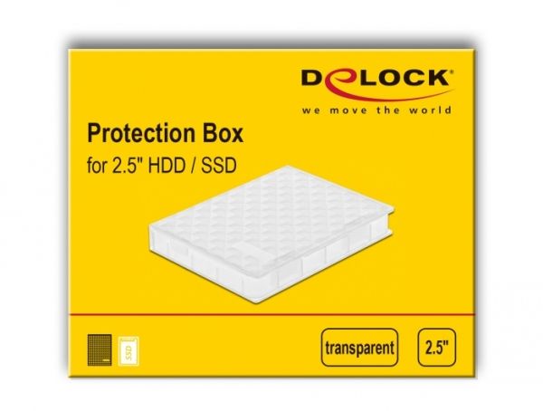This handy box by Delock can be used to store and transport 2.5? HDD or SSD. The hard drive or SSD is protected from damage and remains free of dirt and dust. There is an opening for the SATA connector built in, so that the hard drive or SSD can be connected to a computer while remaining in the box.