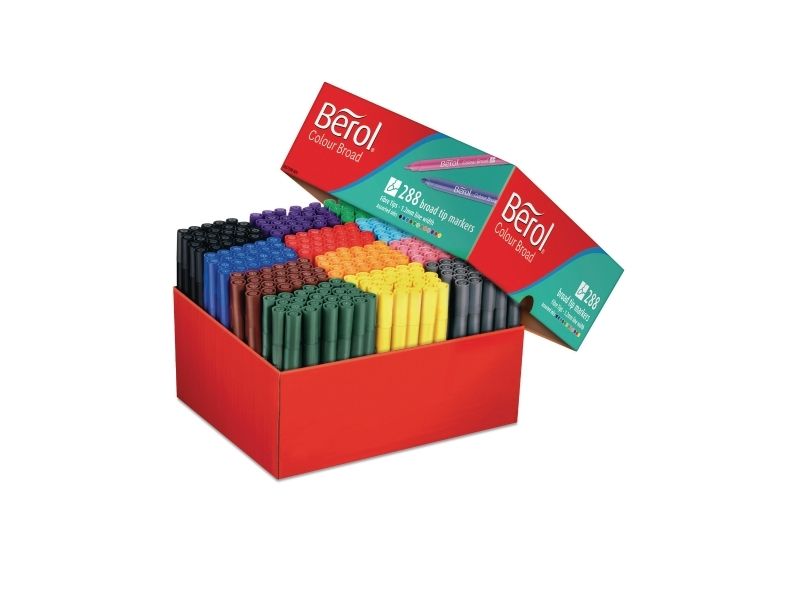 STATEN OG KOMMUNERNES INDKØBSSERVICE A/S Fibertuscher, i høj kvalitet med ekstra lang levetid, og som ikke tørrer ud. tuschen er fyldt med 3 ml vandbaseret blæk, 6 gange mere end andre tuscher. Colourbroad har en bred spids, som gør den velegnet til farvelægning af større flader. Colourbroad liniebredde: 1,7 mm. Best.enhed: sæt a 288 stk. Kolli a 24 sæt.