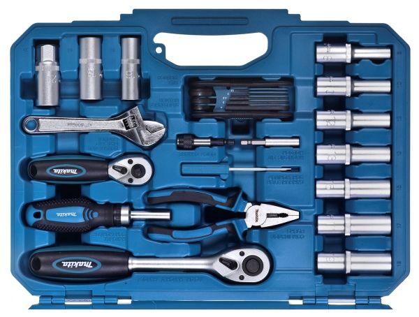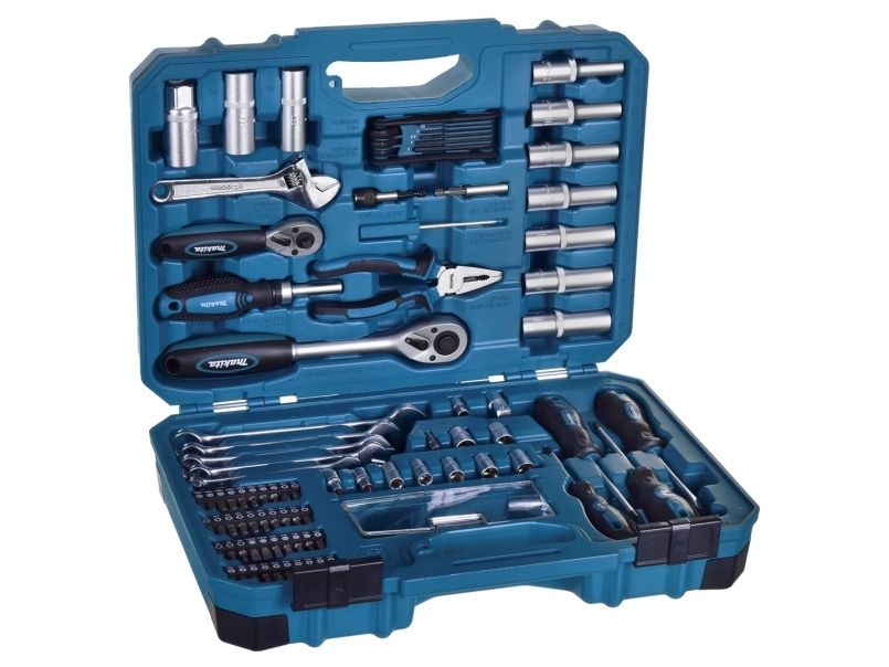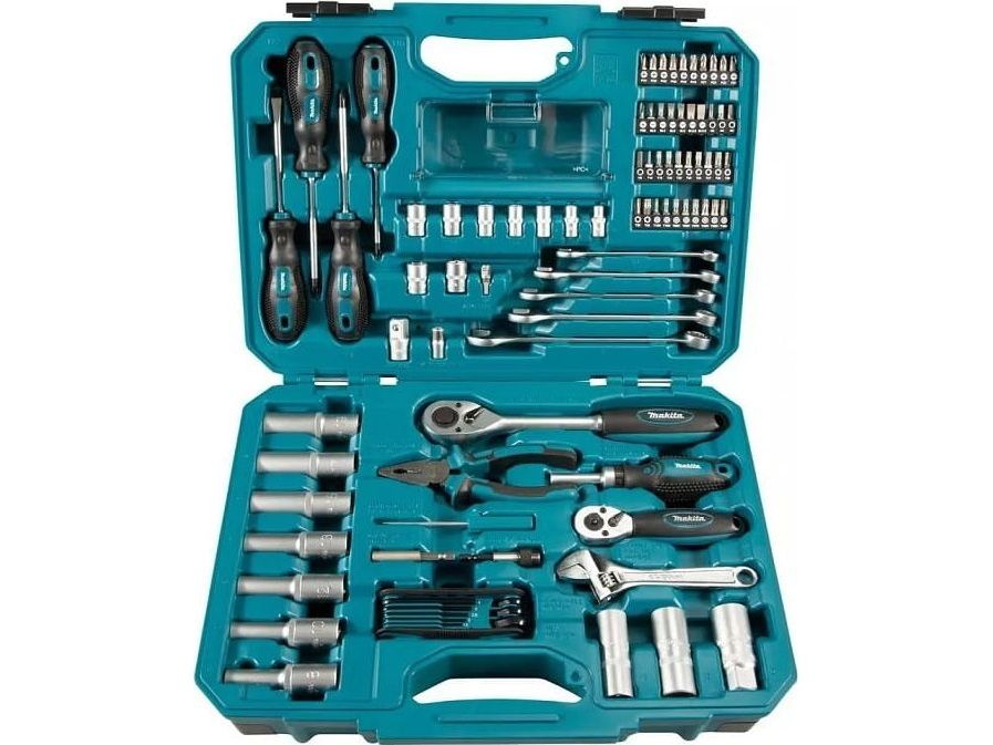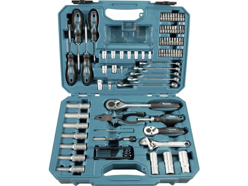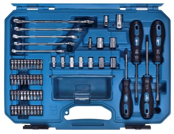 Skrutrekker - pozidriv PZ2, magnetisk bitholder, skrutrekker - phillips PH1, skrutrekker - stjerneskrutrekker PH2, kombinasjonstang, 4 screwdriver bits - hex 3, 4, 5, 6 mm, 9 sockets 1/4" - 5, 6, 7, 8, 9, 10, 11, 12, 13 mm, adjustable wrench - 150 mm, adapter 1/4" sekskant til 1/4"-kvadratisk, skrutrekkerhåndtak - 1/4" spissokkel, skrutrekker - 6 mm-spor, 5 screwdriver bits - pozidriv PZ1, PZ2 (x3), PZ3 x 25 mm, adapter 3/8" to 1/2", coupler - 356 mm, sleeve chuck bit holder, ratchet handle - 1/2", double-ended ratchet handle (1/4" + 3/8"), 7 sockets 1/2" - deep 8, 10,12, 13, 15, 17, 19 mm, 3 sockets 1/2" - spark plug 16, 18, 21 mm, 8 wrenches - hex 1.5, 2, 2.5, 3, 4, 5, 6, 8 mm, 5 combination wrenches - 10, 12, 13, 14, 17 mm, 6 screwdriver bits - phillips PH1, PH2 (x4), PH3 x 25 mm, 6 screwdriver bits - slot 3, 4, 5 (x2), 6.5 (x2) x 25 mm, 11 screwdriver bits - torx T10, T15, T20 (x2), T25 (x2), T27, T30 (x2), T35, T40 x 25 mm, 8 screwdriver bits - tamper-proof torx T10H, T15H, T20H, T25H, T27H, T30H, T35H, T40H x 25 mm