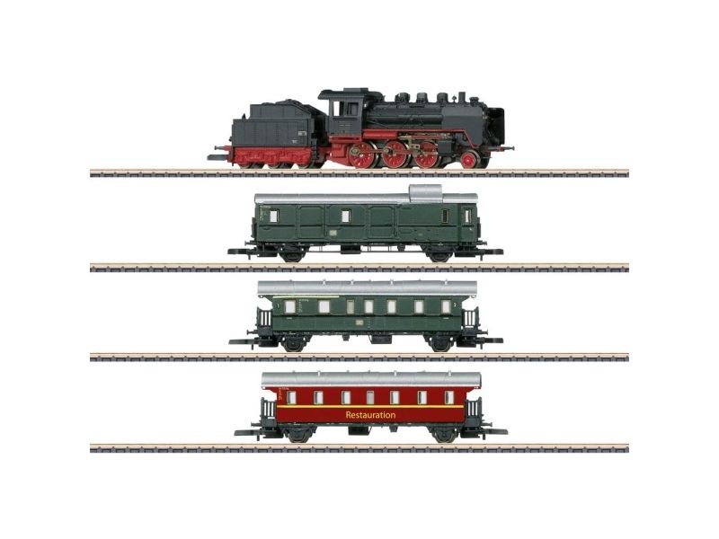 Z startsæt museumstog Damplokomotiv med indbygget pendelautomatik · stor sporkreds · lokomotiv BR 24 af metal · tender af plast · teknisk revideret model med klokkeankermotor, drevet af alle drivaksler · kuppelstænger · hjulsæt sort forniklet · med sorte skivehjulsæt Museum-damplokomotiv 24 009 med bagagevogn PWI, gennemgangsvogn 1./2. Klasse og restvogn WRI i aktuel driftstilstand.