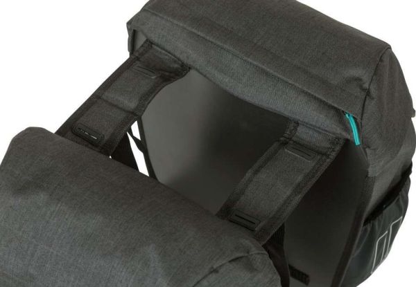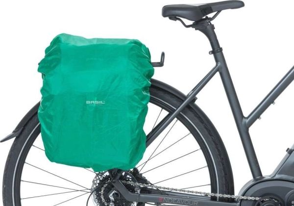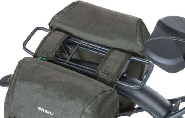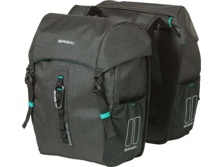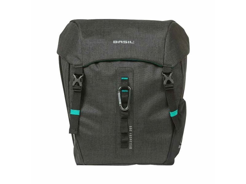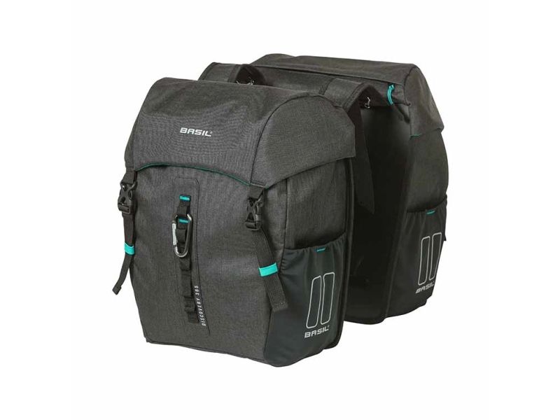 Basil Discovery 365D - double bicycle bag M - 18 liter - black melee The Basil Discovery 365D is a sporty double pannier for the back of your bicycle. A waterproof rain cover is included.