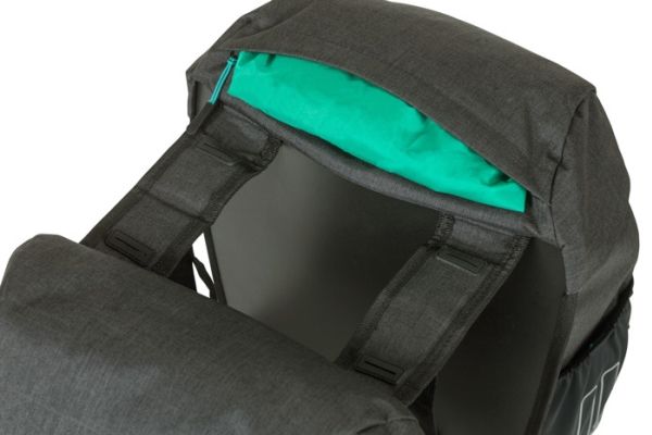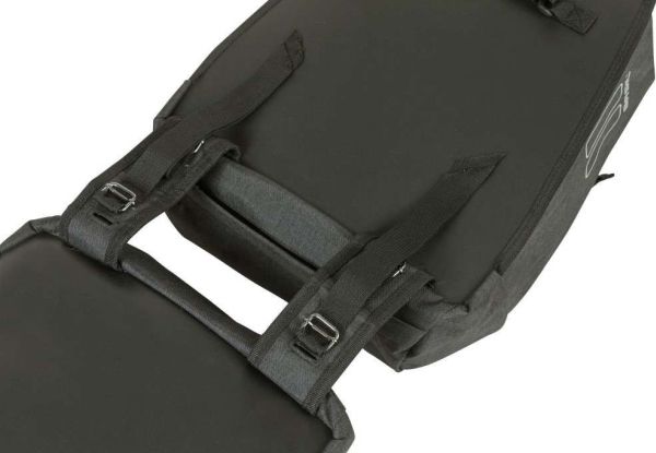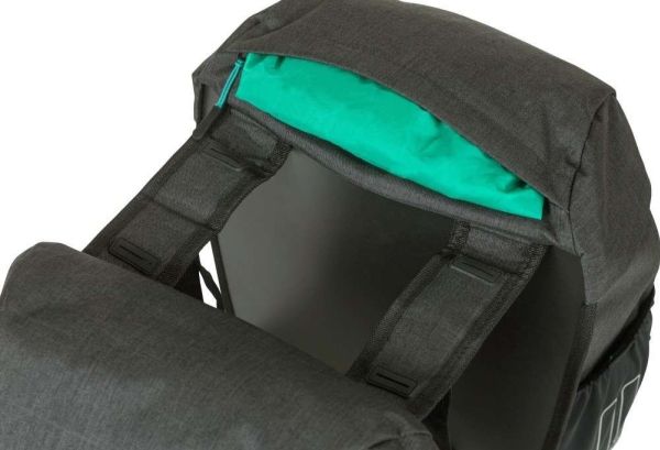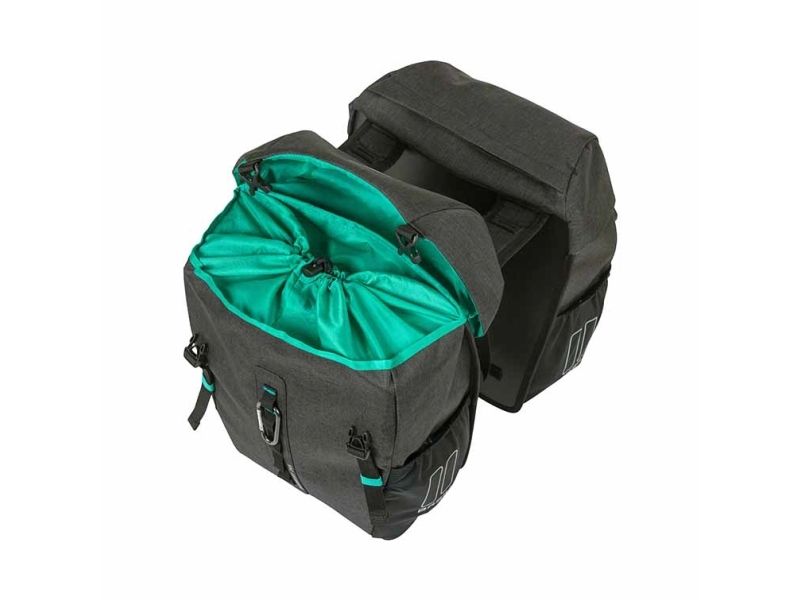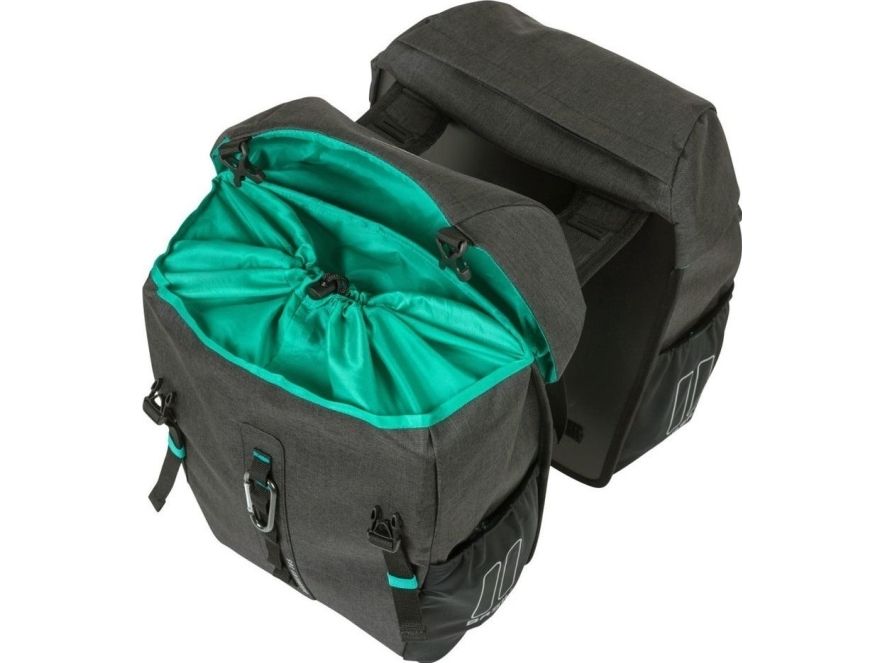 The Basil Discovery 365D is a sporty and compact double pannier. The bag in black melee is made of polyester and includes a waterproof rain cover. The bag is lightweight, with a capacity of 18 litres; it is a compact size ideal for longer recreational bicycle rides. The double bicycle bag has several compartments where you can carry accessories such as a bottle, repair kit or a towel, as well as being suitable for carrying smaller items. The reflective accents on the bag make you more visible in the dark. The double bicycle bag comes with a carabineer from which you can hang a cup or a bottle. The bag can easily be attached to your bicycle’s carrier.