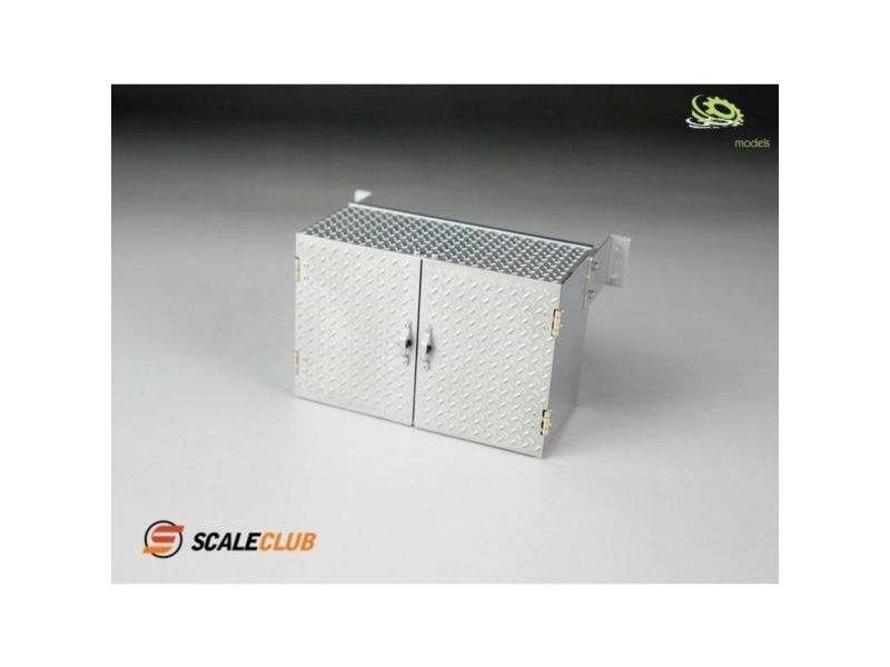 1:14 Køboks 90mm med dobbeltdøre, riffelplade V2A 1:14 Køboks med dobbelfløjdøre af V2A-plade. Dørene kan åbnes og holdes ved hjælp af magneter.