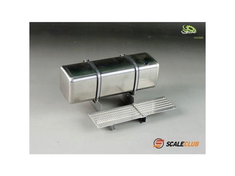 1:14 tank til montering bag førerhuset med batteriboks Tank 165 x 50 x 50 mm Platform 145 x 40 mm Dybde i alt: 100 mm. Komplet tank i rustfrit stål med arbejdsplatform og montagestel. Tanken kan åbnes for at optage kørebatteriet.