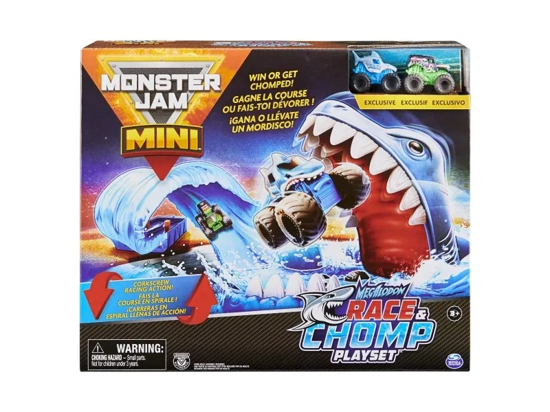 Get ready for face off your favorite Monster Jam mini trucks with the Mini Megalodon Race and Chomp Playset! Race through a wicked wave and into a giant shark head! Are you fast enough to make it through the wave without getting chomped? The playset includes 2 exclusive Monster Jam Mini trucks – Megalodon and Grave Digger! Monster Jam Mini trucks put the Monster Jam action in the palm of your hand! Each Monster Jam Mini truck is packed with awesome details and graphics, just like its large-scale version! Place the Monster Jam Mini trucks into the launcher. Choose between 3 speeds and launch your Monster Jam mini truck into action! Watch them torpedo through the epic wave and into the chomping Shark head! Compatible with all your favorite official Monster Jam Mini trucks. Compact and small in size, these 1:87 scale mini monster trucks are ready for epic Monster Jam action! Smash, bash and crash your way through your own Monster Jam course! With so many Monster Jam Mini trucks to collect, add Max-D, El Toro Loco and more (each sold separately) to your collection and race them all! Bring home the Monster Jam action with the Megalodon Race and Chomp Playset!