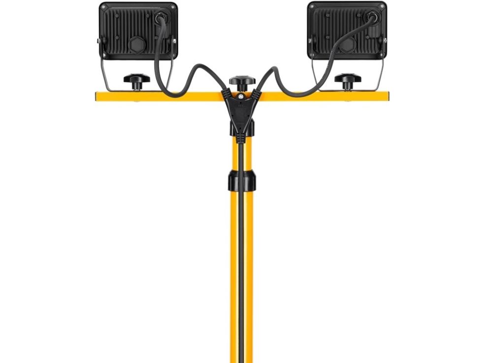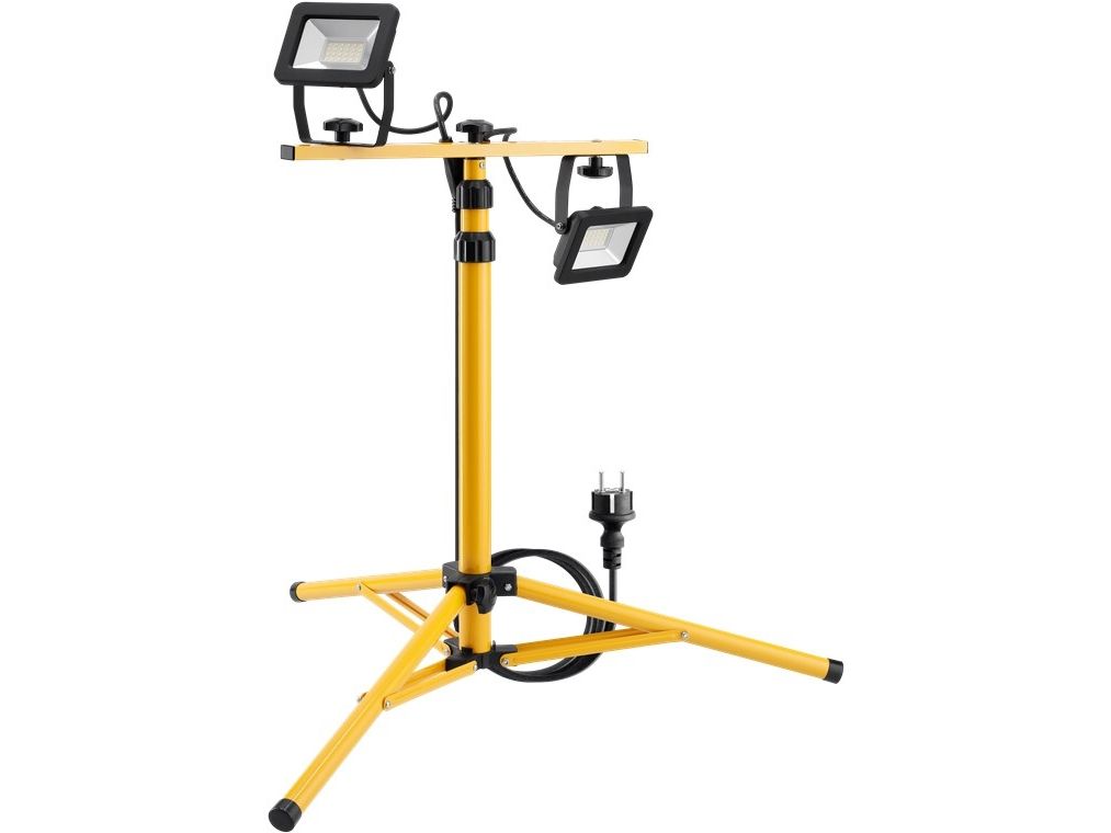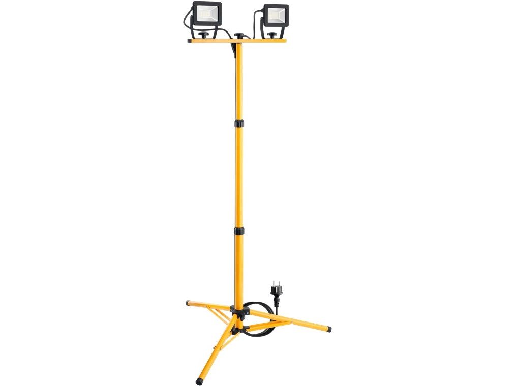med i alt 3400 lm og neutralt hvidt lys (4000 K), velegnet til indendørs og udendørs brug (IP65) ”Plug & Play” arbejdslampe med dobbelt hovede og stor belysning til renovering, værksted, garage og kælder Rotationsvinkel af lygtehovedet: 360°, drejevinkel: 180° Projektør med et robust, højdejusterbart metalstativ (63 cm - 137 cm), sammenfoldelig for nem opbevaring Stødfast støbt aluminiumshus, gennemsigtigt og hærdet glas, der sikrer lang levetid på byggepladser Energibesparelser på op til 80 % sammenlignet med halogenlampens arbejdslamper. LED projektør med sikkerhedsstik og 2,5 m kabel af typen H05RN-F 3G1,0 mm² – middel robusthed til alle husholdningsformål Mål: 76 x 76 x 152 cm (L x B x H), lampehøjde op til maks. 152 cm