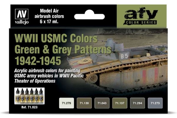 WWII USMC Colors, Green and grey patterns 1942-1945, includes a variety of green tones as well as the well-known Ocean Grey used in the vehicles in landing operationsContains 6x17 ml.