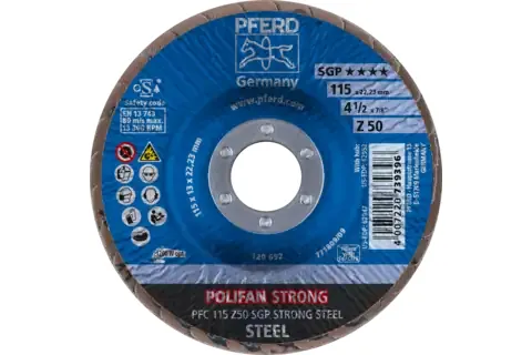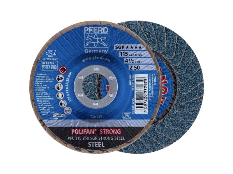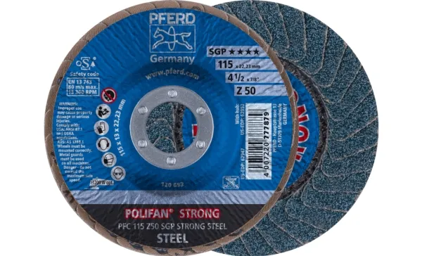 Lamelslibeskive Den innovative Stjernefjederskive POLIFAN-STRONG er et unikt værktøj med et særligt højt præstationsniveau. Takket være den patenterede konstruktion har den en betydeligt bedre effektivitet i forhold til almindelige stjerneskiver.Drevtyper:- VinkelsliberAnvendelser:- Afgratning- Tilfasning- Svejsesøm bearbejdningAnvendelsesanbefaling:- Kornstørrelse 36 optimalt egnet til en høj materialefjernelse, for B. Ved svejsessømbearbejdning.- Kornstørrelse 50 optimalt egnet til kantbearbejdning, for B. Stier eller for at opnå fine overflader.Materiale:- StålProduktfordele:- Hurtig slibning med konstant slibeside indtil sidste slibekorn.- Ultimativ effektivitet takket være maksimal materialefjernelse pr. tidsenhed og mindre diskogforbrug.- Ultimativ lang levetid.