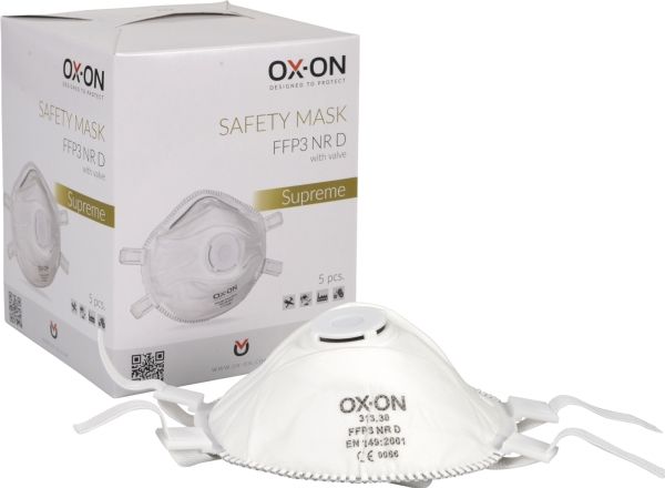 OX-ON Mask FFP3NR D w/Valve Supreme er den sikkerhedsgodkendte og filtrerende støvmaske med ventil, som du kan anvende ved arbejde med sundhedsskadelige, tørre partikler og væskeformige aerosoler med en grænseværdi 5 mg/m3 (Max. koncentration 50 x grænseværdi.)Du kan med fordel bruge engangsmasken, når du arbejder med aerosoler med middel til svær giftighed samt arbejde med partikler og aerosoler fra fx cement, kalk, gødning, asbest, kaustisk soda, svejserøg - og bakterier, svampesporer, vira mv.Den ekstremt komfortable maske er dolomit-testet, hvilket betyder, at du får et værnemiddel med særlig stor støvkapacitet, hvor modstanden stiger langsomt. Samtidig er kvalitets-masken udstyret med en ventil, som sikrer dig en god komfort og et behagelig klima i masken, når du bruger den. Ventilen er med til at forhindre ophobning af fugt og varme, når du har masken på.Blød skumgummi som tætning ved næsen samt formbar alu-næseklemme sikrer dig en perfekt og komfortabel tilpasning til dit ansigt. Maskens elastikbånd er latexfri.Du får 5 stk. masker pr. æske.
