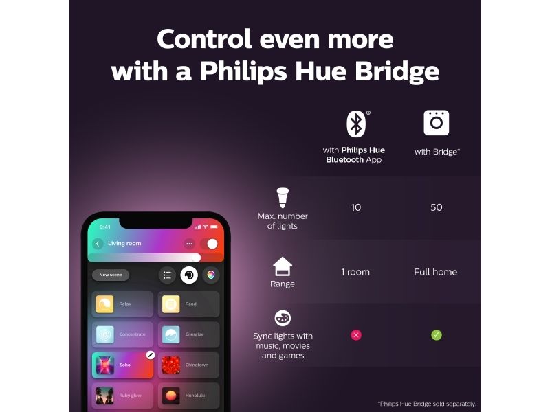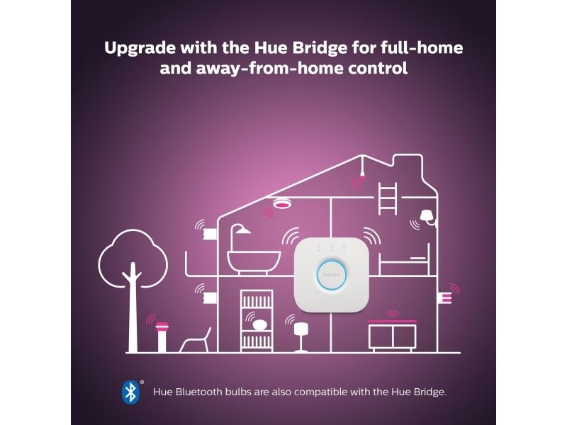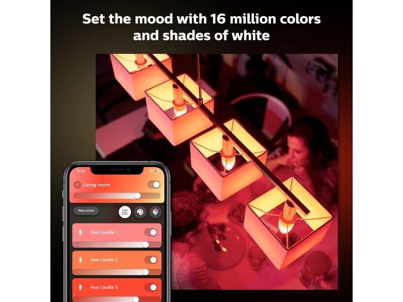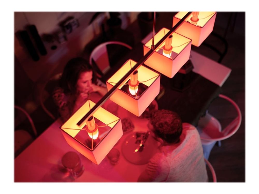 Sett farge på hvilket som helst rom med en smart candelabra-lyspære, som gir lys fra varmhvitt til kjølig hvitt samt 16 millioner farger. Bruk Bluetooth til umiddelbar styring av lyset i et rom, eller koble til Hue Bridge for å låse opp alle funksjonene.