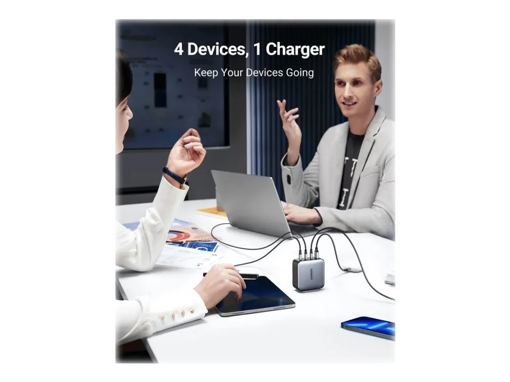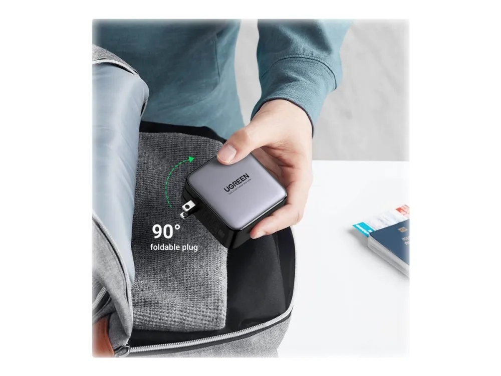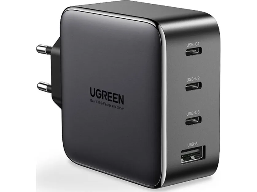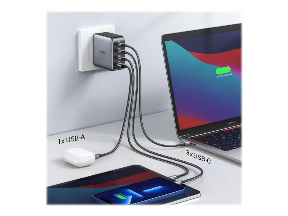 Powered by the Navitas GaN Power IC, the UGREEN 100 W GaN Fast Charger have a smller size but stronger power. Simultaneously charge 4 devices at full speed and save up to 1 hour of charging time with UGREEN 100 W USB C charger. All ports support QC (quick charge) agreement. Only one charger meets all your charging needs.
