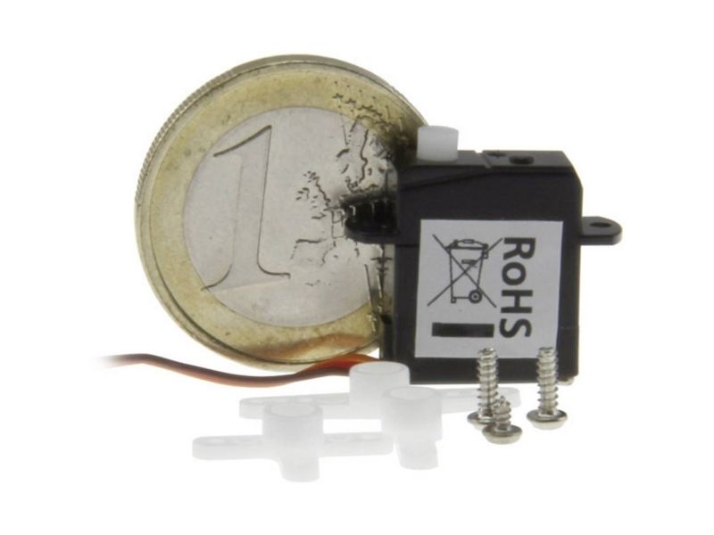 Denne servo er kendetegnet ved de mindste mål (13,5 x 16 x 6 mm) og en ekstremt lav vægt (1,8 g). Alligevel tilbyder den en drivkraft på 0,25 kg / cm² ved 6 V og er i modsætning til mange andre mikroservoer beskyttet med sit klassiske kabinet. Den egner sig derfor fremragende til de mindste modeller, specialfunktioner og modeller, der på grund af deres form kun giver lidt plads til indbygning af en servo. Ud over den klassiske styring er der ingen grænser for fantasien; hejse- og sænkningsbevægelser, døråbnere, signalmaster, koblinger og så videre. Næsten alt er nu muligt på en nem måde. Servoen har et JST-stik. Med vores JST-JR-adapter kan servoerne også tilsluttes direkte til JR-stik.