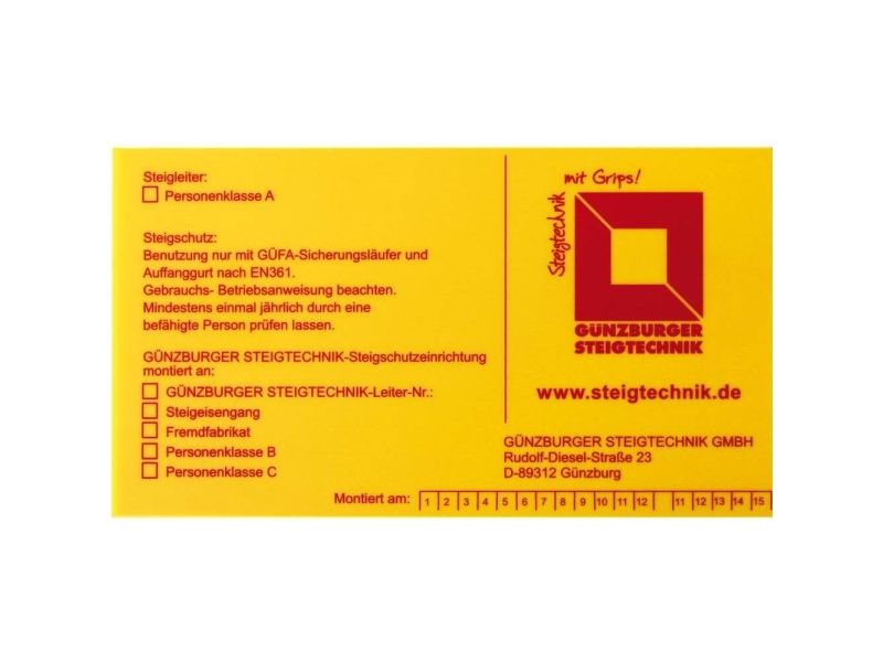 Mærkningsskilt til stigebeskyttelsesanordning til beskyttelse mod stigninger Til montering på hver enkelt stige- og udstigningssted på stigespor iht. din 18799-1 og din en ISO 14122-4 samt på stigeskinner med stigebeskyttelse
