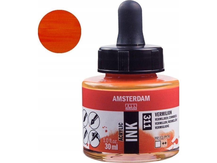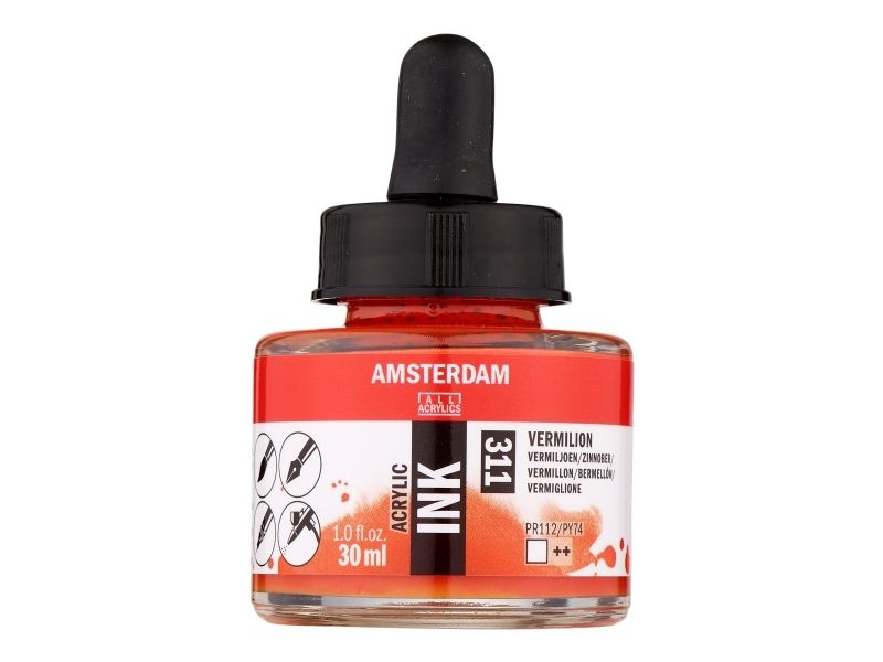 Amsterdam acrylic ink is incredibly versatile. Made with a high concentration of high-quality pigments, this ultra-fluid acrylic blends ink properties with the benefits of acrylic paint – it doesn’t fade and it dries quickly with a permanent finish. Vermilion (311) is a transparent color with a very good lightfastness (++).